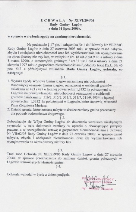 | Uchwała nr XLVI/294/06 Rady Gminy w Łagowie z dn. 31 lipca 2006 r. w sprawie wyrażenia zgody na zamianę nieruchomości. | 2008-10-02 |