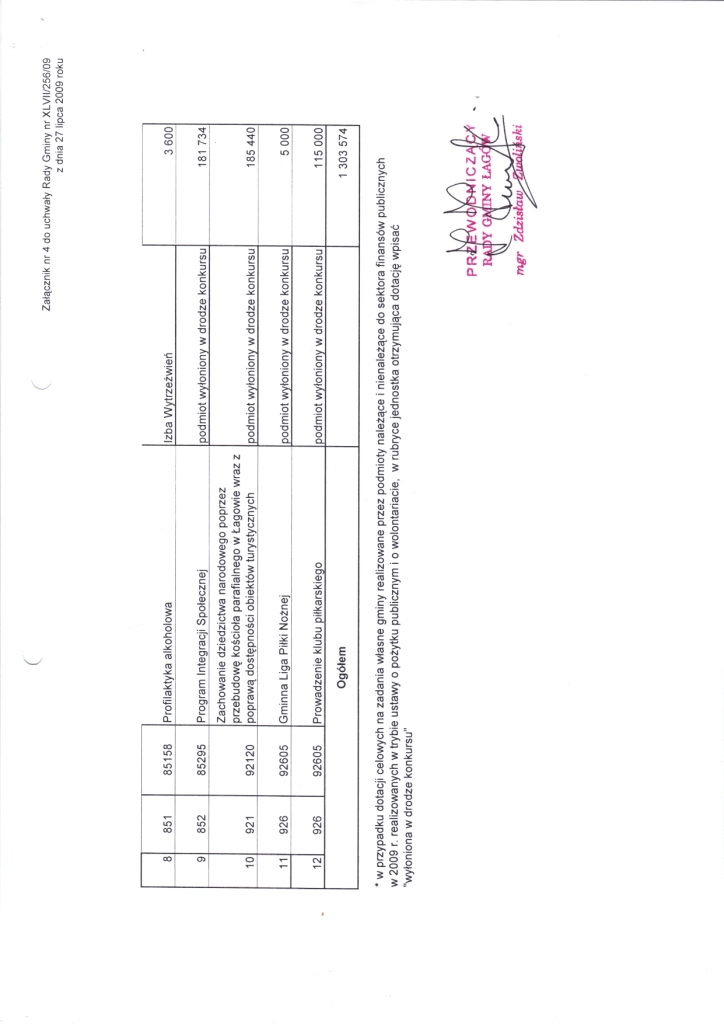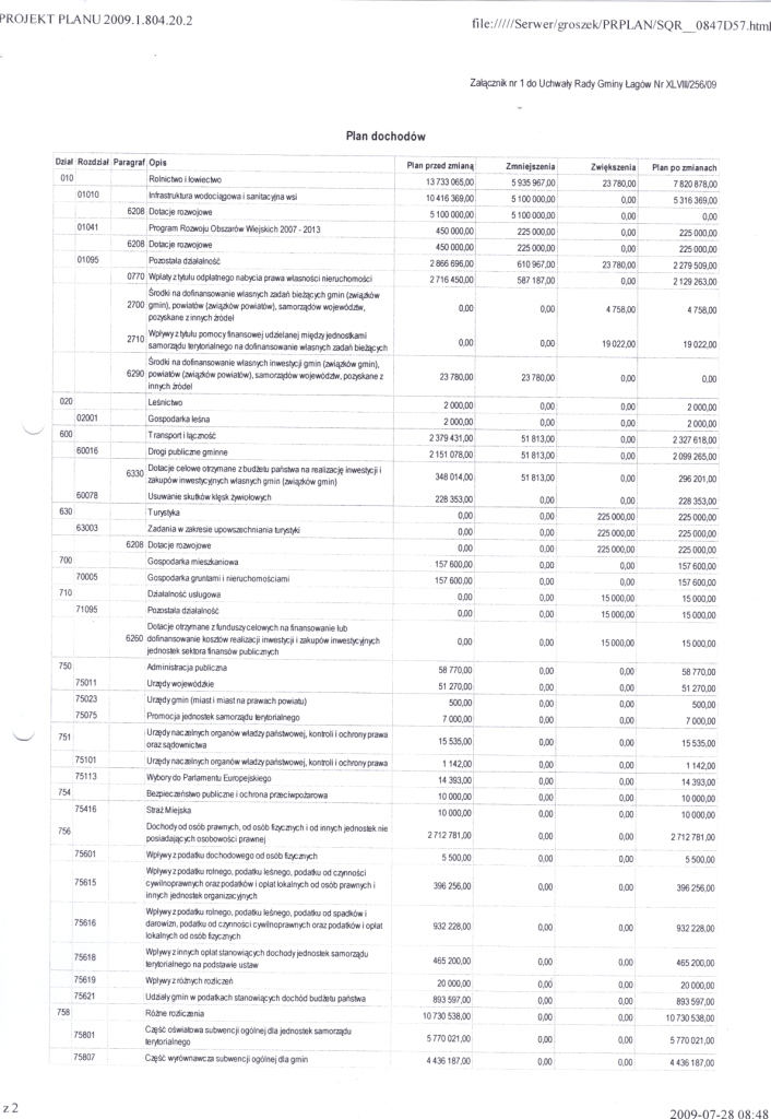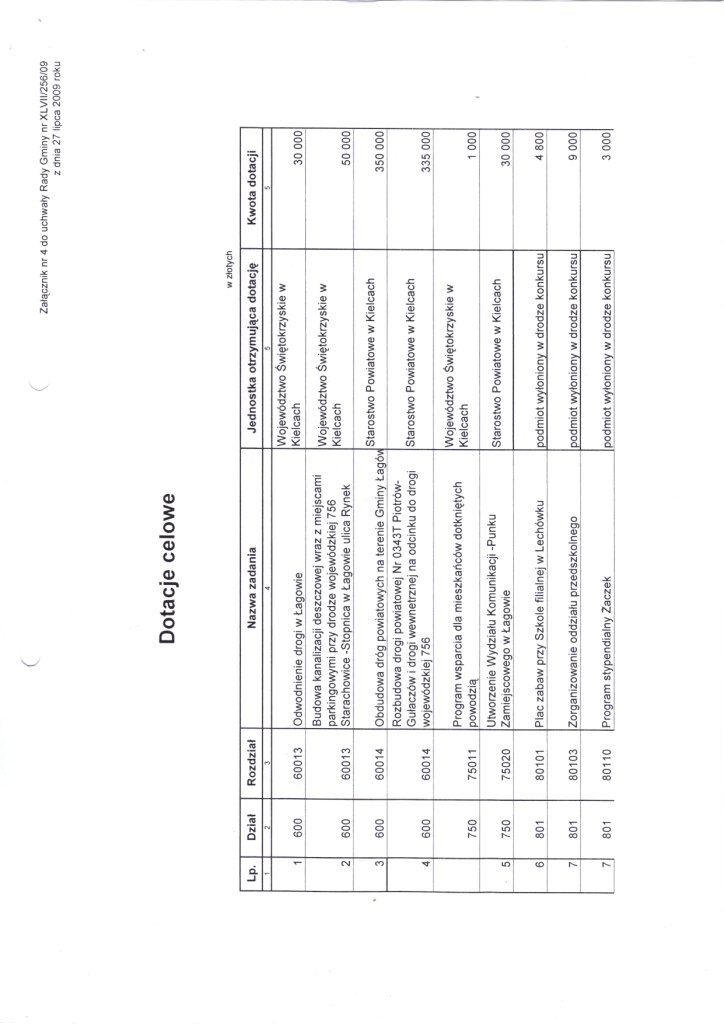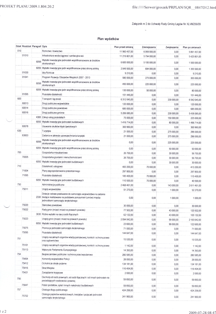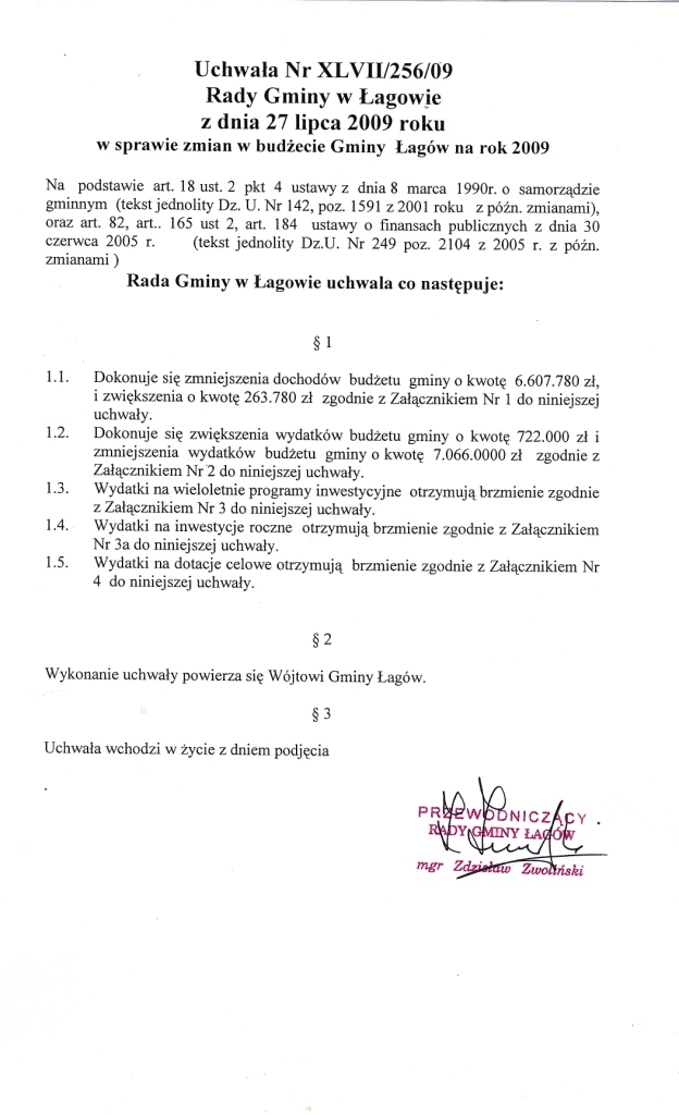 | Uchwała Nr XLVII/256/09 Rady Gminy w Łagowie z dnia 27 lipca 2009r. w sprawie zmian w budżecie Gminy Łagów na 2009 rok. | 2009-08-05 |