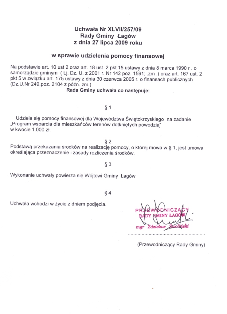 | Uchwała Nr XLVII/257/09 Rady Gminy Łagów z dnia 27 lipca 2009r. w sprawie udzielenia pomocy finansowej | 2009-08-05 |