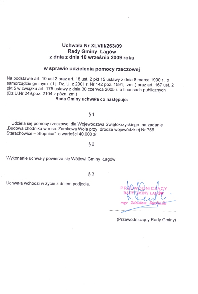 | Uchwała Nr XLVIII/263/09 Rady Gminy w Łagowie z dnia 10 września 2009r. w sprawie udzielenia pomocy rzeczowej. | 2009-09-18 |