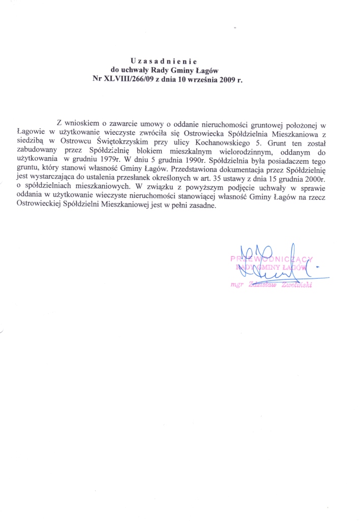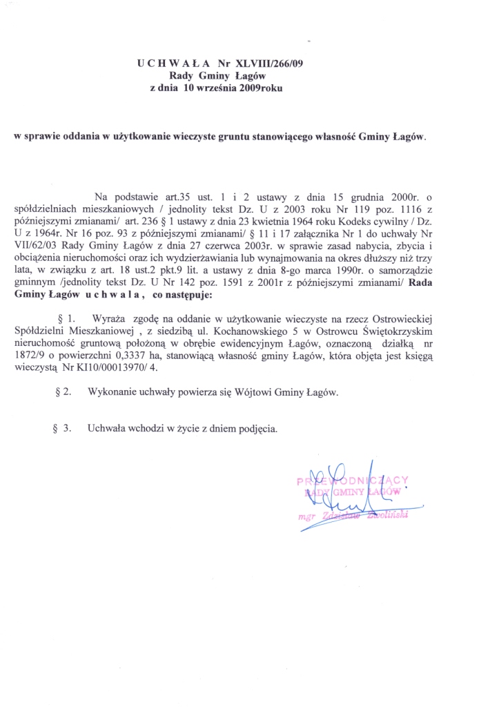 | Uchwała Nr XLVIII/266/09 Rady Gminy Łagów z dnia 10 września 2009r. w sprawie oddania w użytkowanie wieczyste gruntu stanowiącego własność Gminy Łagów. | 2009-09-18 |