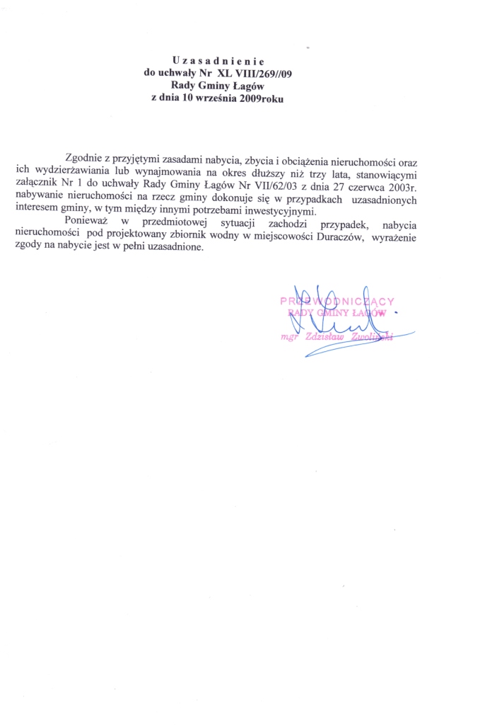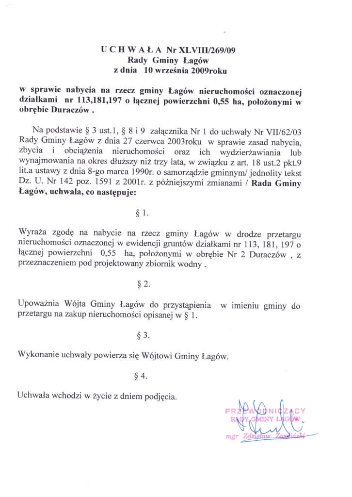 | Uchwała Nr XLVIII/269/09 Rady Gminy Łagów z dnia 10 września 2009r. w sprawie nabycia na rzecz gminy Łagów nieruchomości oznaczonej działkami nr 113,181,197 o łącznej powierzchni 0,55 ha, położonymi w obrębie Duraczów. | 2009-09-18 |