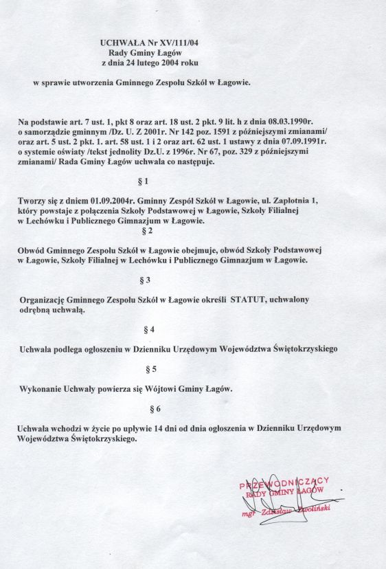 | Uchwała nr XV/111/04 Rady Gminy w Łagowie z dn. 24 lutego 2004 r. w sprawie utworzenia Gminnego Zespołu Szkół w Łagowie. | 2008-10-22 |