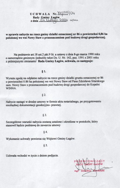 | Uchwała nr XV/115/04 Rady Gminy w Łagowie z dn. 24 lutego 2004 r. w sprawie nabycia na rzecz gminy działki oznaczonej nr 86 o powierzchni 0,86 ha położonej we wsi Nowy Staw z przeznaczeniem pod budowę drogi gospodarczej. | 2008-10-22 |