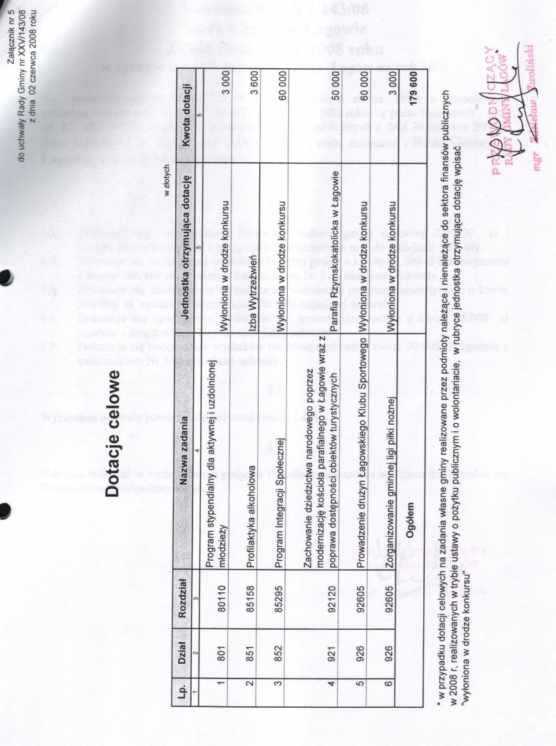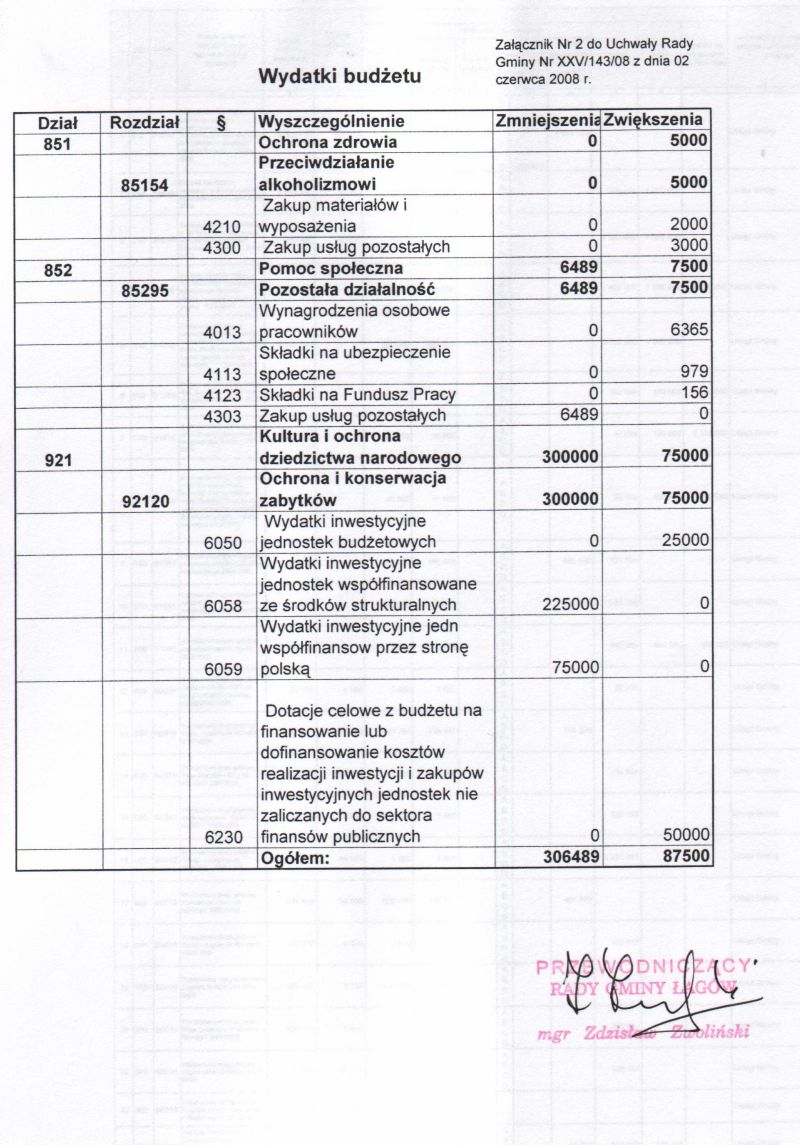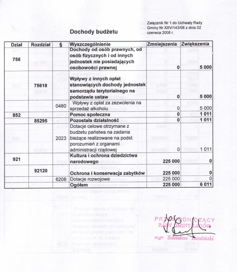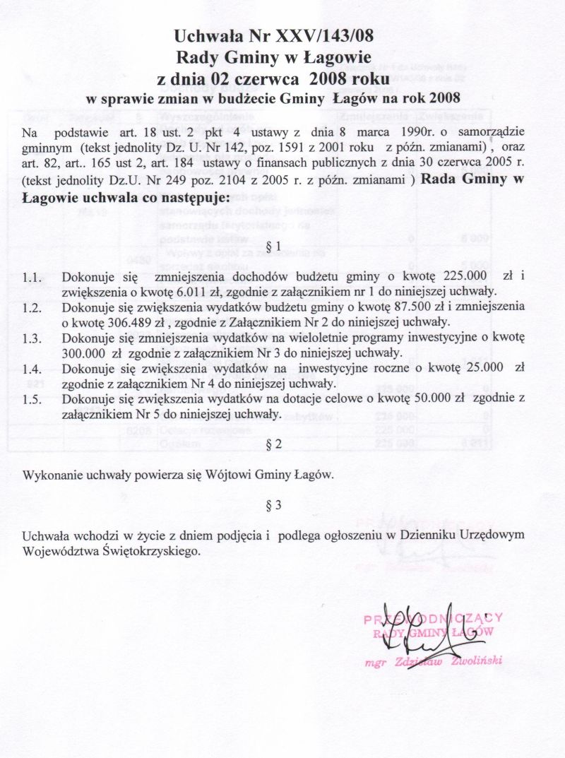 | Uchwała nr XV/143/08 Rady Gminy Łagów z dnia 2 czerwca 2008 r. w sprawie zmian w budżecie Gminy Łagów na rok 2008 | 2008-08-18 |