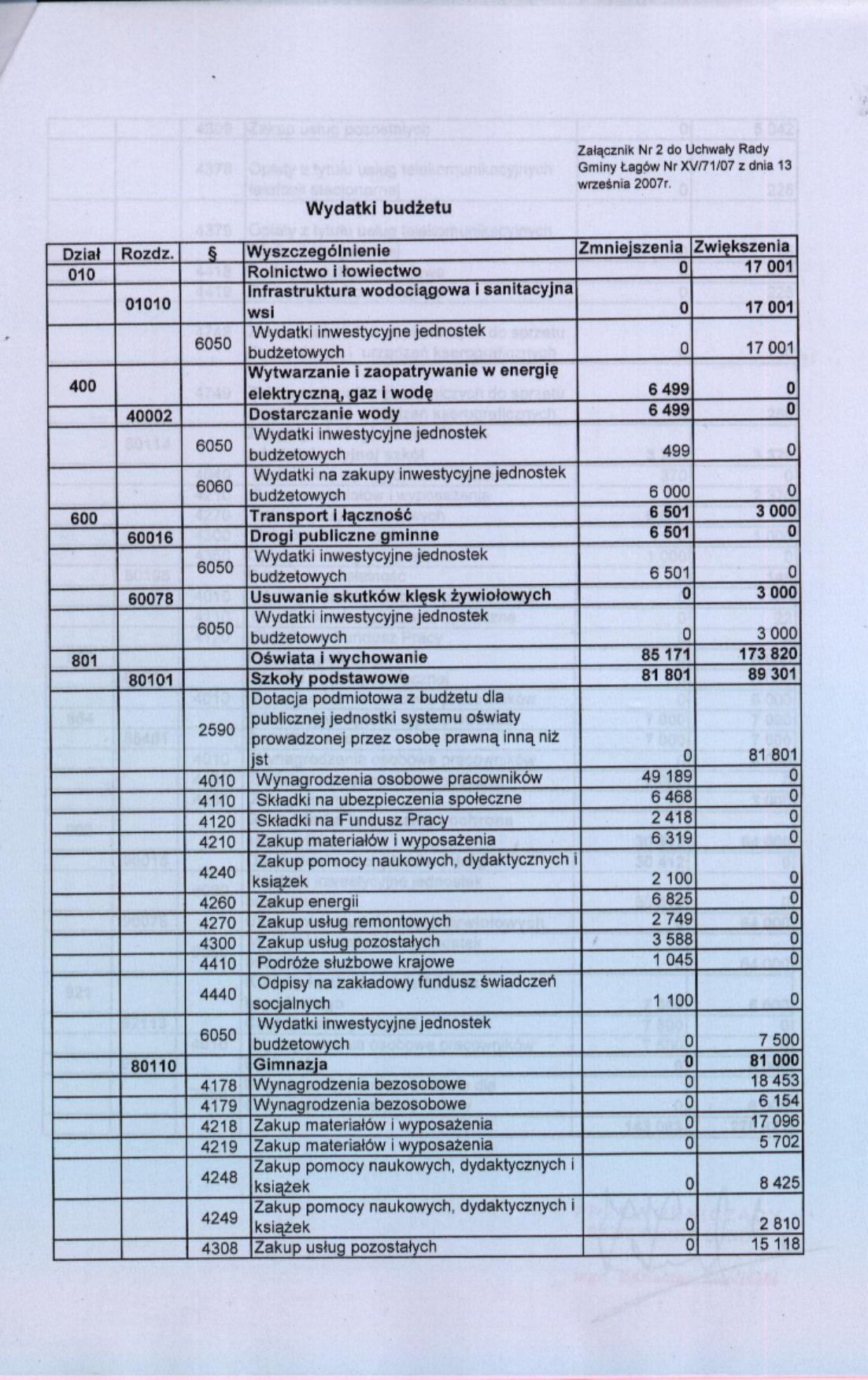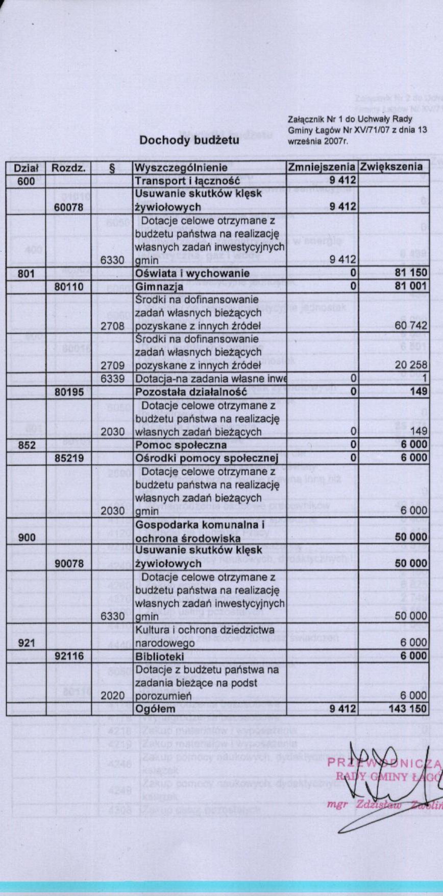 | Uchwała nr XV/71/07 Rady Gminy Łagów z dnia 13 września 2007 r. w sprawie zmian w budżecie Gminy Łagów na rok 2007 | 2008-08-26 |