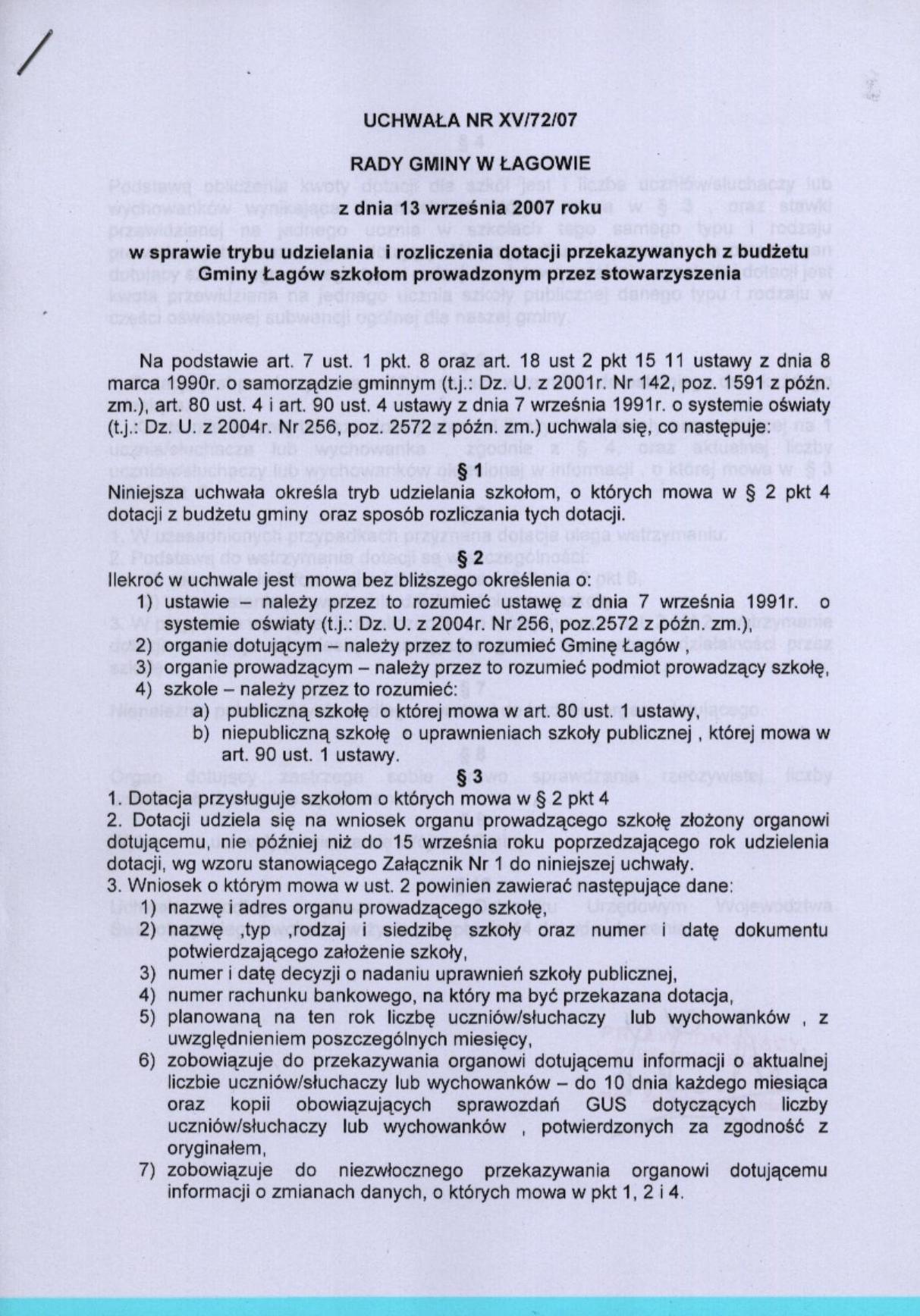 | Uchwała nr XV/72/07 Rady Gminy Łagów z dnia 13 września 2007 r. w sprawie trybu udzielania i rozliczania dotacji przekazywanych z budżetu Gminy Łagów szkołom prowadzonym przez stwowarzyszenia | 2008-08-26 |
