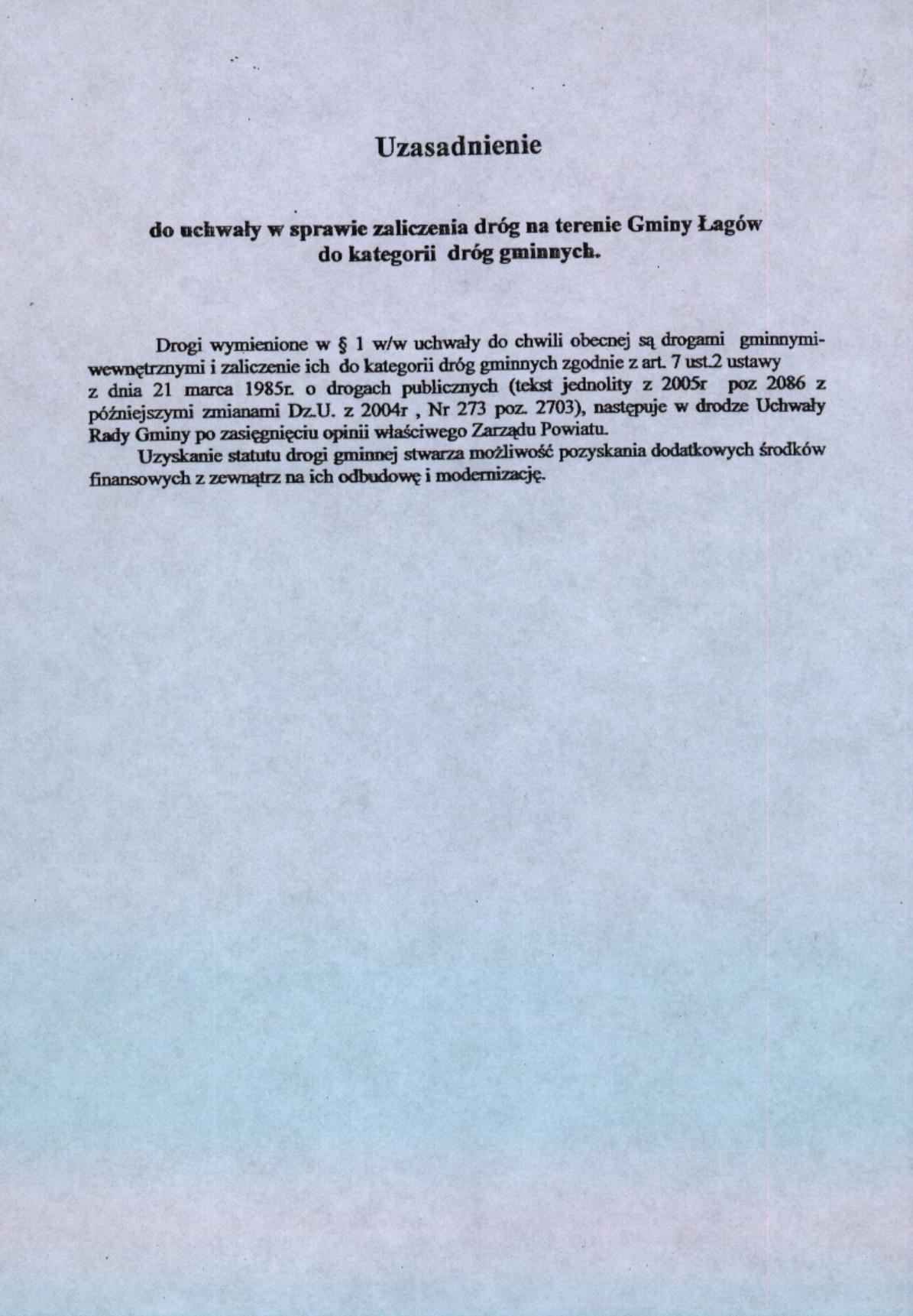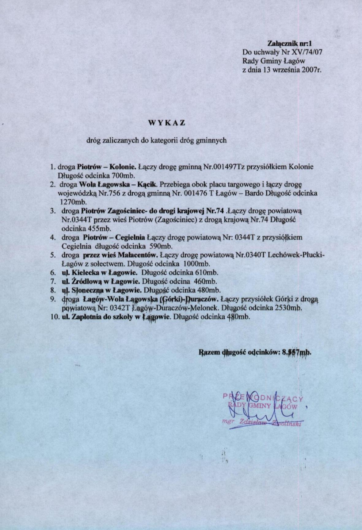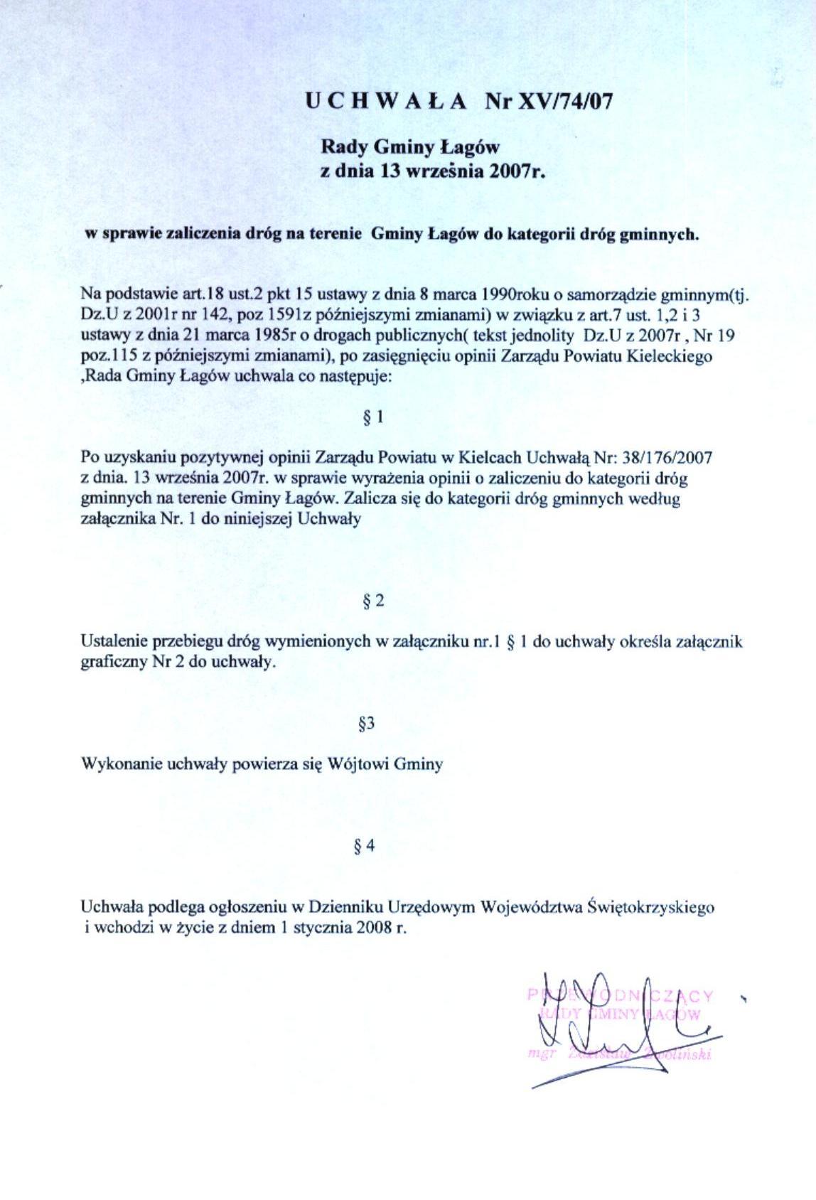 | Uchwała nr XV/74/07 Rady Gminy Łagów z dnia 13 września 2007 r. w sprawie zaliczenia dróg na terenie Gminy Łagów do kategorii dróg gminnych | 2008-08-26 |