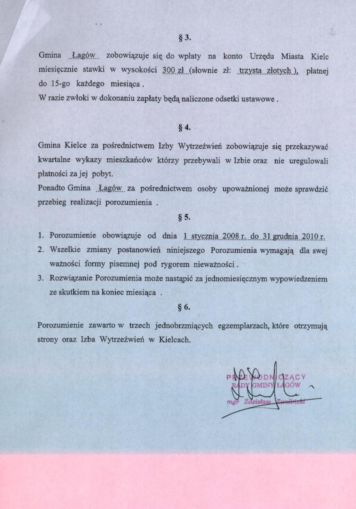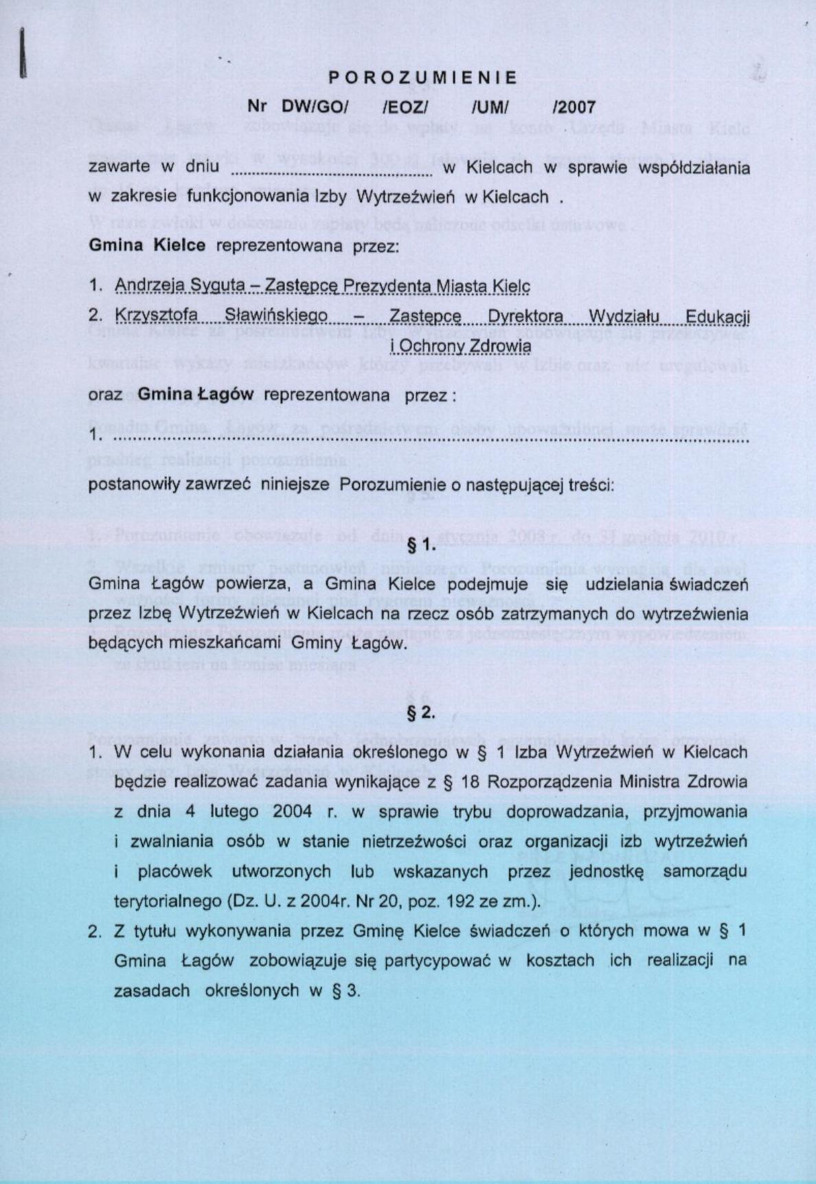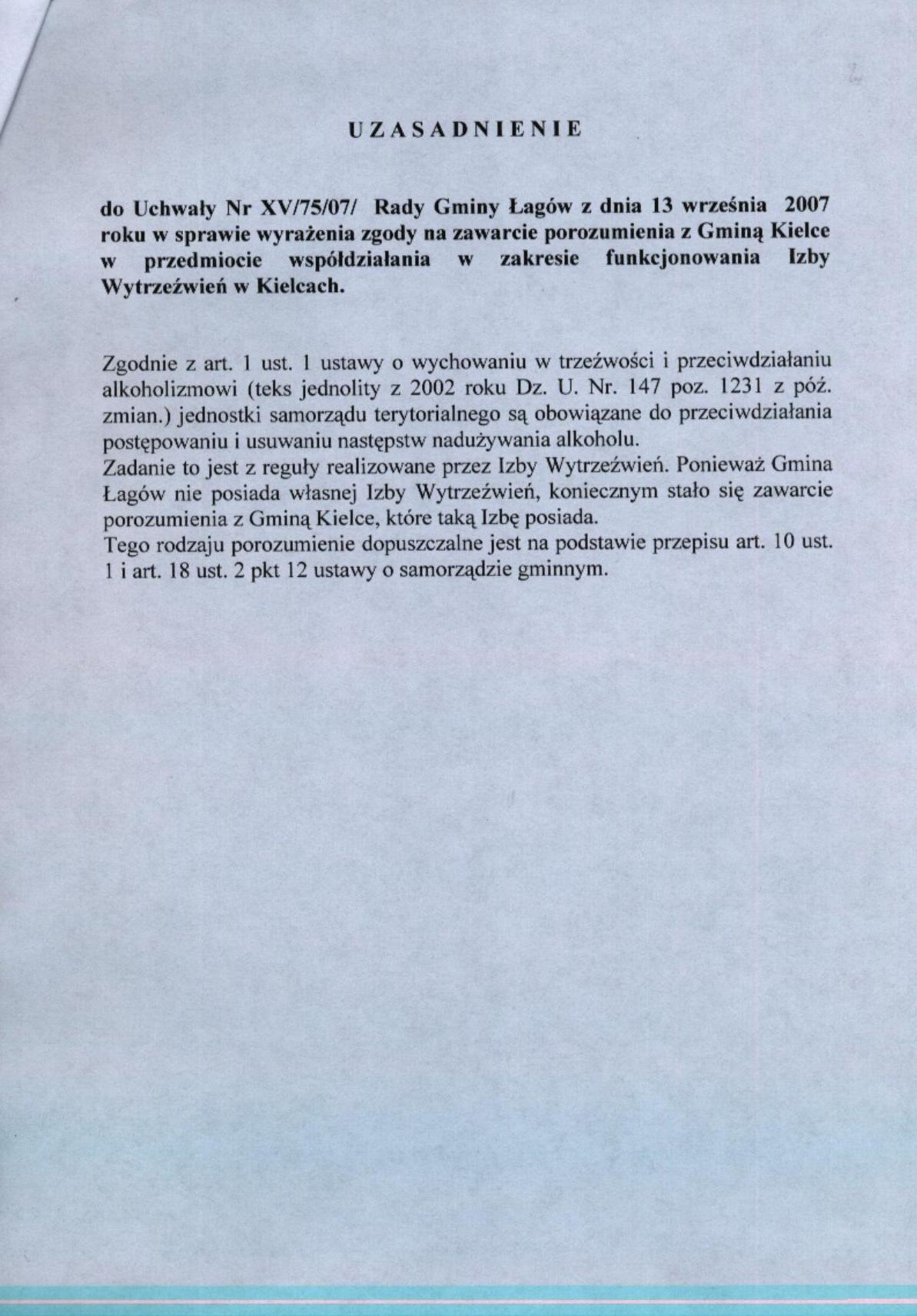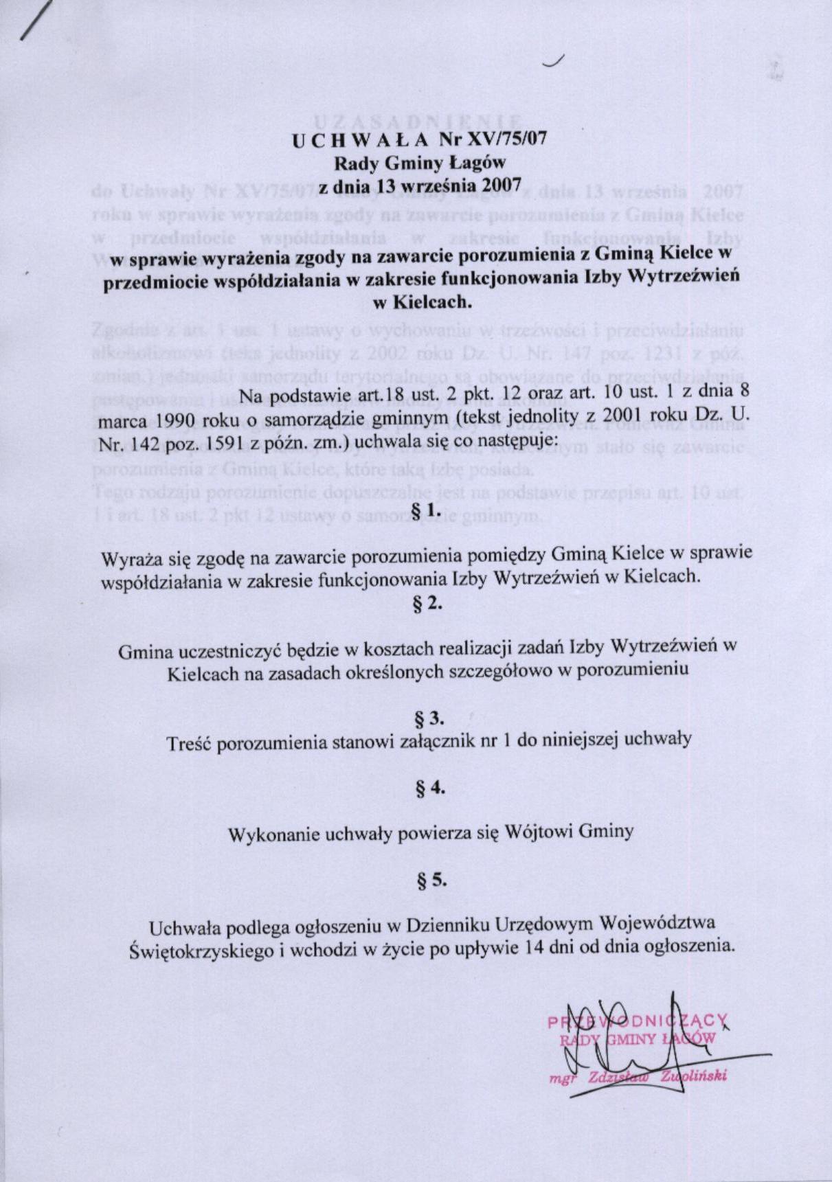 | Uchwała nr XV/75/07 Rady Gminy Łagów z dnia 13 września 2007 r. w sprawie wyrażenia zgody na zawarcie porozumienia z Gmina Kielce w przedmiocie współdziałania w zakresie funkcjonowania Izby WytrzeźwieĂą w Kielcach | 2008-08-26 |