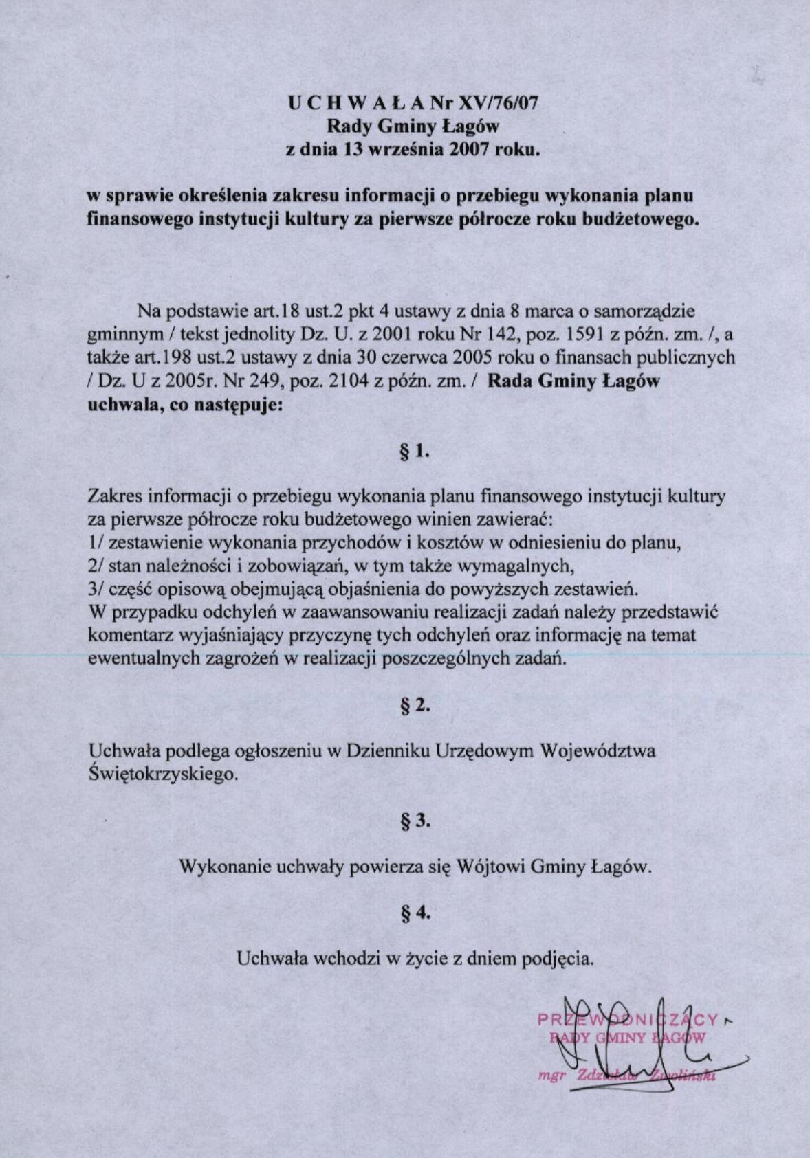 | Uchwała nr XV/76/07 Rady Gminy Łagów z dnia 13 września 2007 r. w sprawie okreslenia zakresu informacji o przebiegu wykonania planu finansowego instytucji kultury za pierwsze półrocze roku budżetowego | 2008-08-26 |