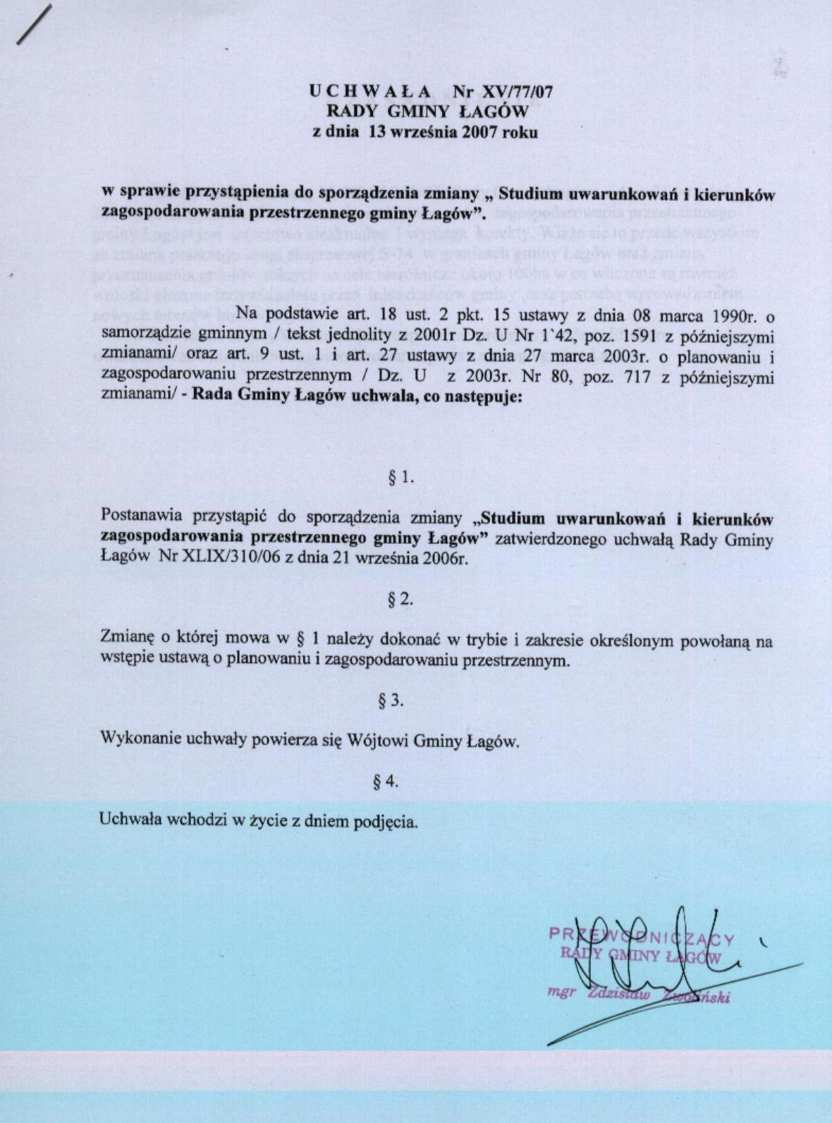 | Uchwała nr XV/77/07 Rady Gminy Łagów z dnia 13 września 2007 r. w sprawie przystąpienia do sporządzenia zmiany "Studium uwarunkowaĂą i kierunków zagospodarowania przestrzennego gminy Łagów" | 2008-08-26 |