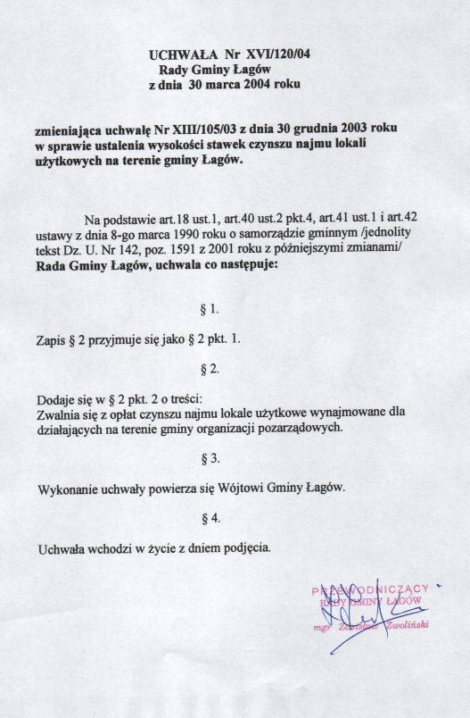 | Uchwała nr XVI/120/04 Rady Gminy w Łagowie z dn. 30 marca 2004 r. zmieniająca uchwałę Nr XIII/105/03 z dnia 30 grudnia 2003 roku w sprawie ustalenia wysokości stawek czynszu najmu lokali użytkowanych na terenie gminy Łagów. | 2008-10-22 |