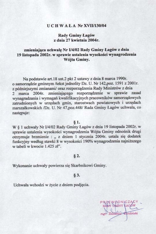 | Uchwała nr XVII/130/04 Rady Gminy w Łagowie z dn. 27 kwietnia 2004 r. zmieniająca uchwałę Nr I/4/02 Rady Gminy Łagów z dnia 19 listopada 2002r. w sprawie ustalenia wysokości wynagrodzenia Wójta Gminy. | 2008-10-22 |