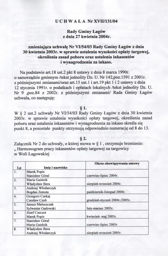 | Uchwała nr XVII/131/04 Rady Gminy w Łagowie z dn. 27 kwietnia 2004 r. zmieniająca uchwałę Nr VI/54/03 Rady Gminy Łagów z dnia 30 kwietnia 2003r. w sprawie ustalenia wysokości opłaty targowej, określenia zasad poboru. | 2008-10-22 |