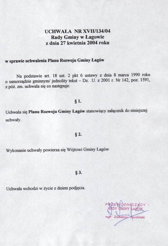 | Uchwała nr XVII/134/04 Rady Gminy w Łagowie z dn. 27 kwietnia 2004 r. w sprawie uchwalenia Planu Rozwoju Gminy Łagów. | 2008-10-22 |