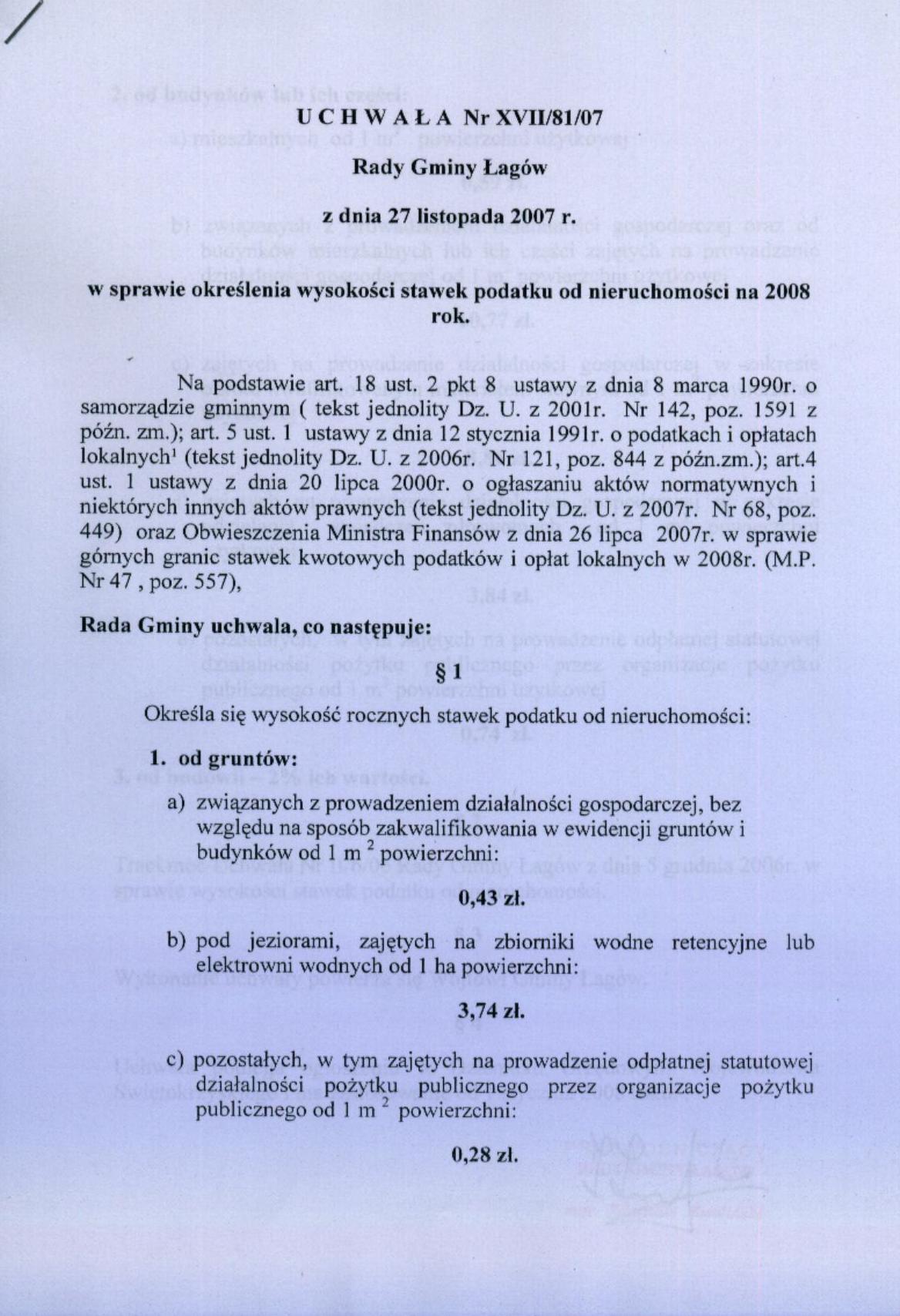 | Uchwała nr XVII/81/07 Rady Gminy Łagów z dnia 27 listopada 2007 r. w sprawie okreśenia wysokości stawek podatku od nieruchomośći na 2008 rok | 2008-08-26 |
