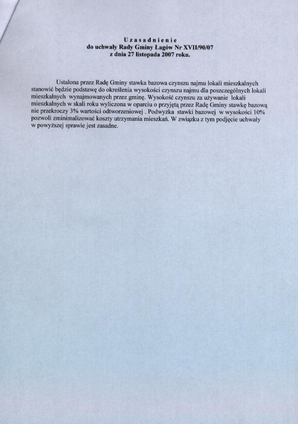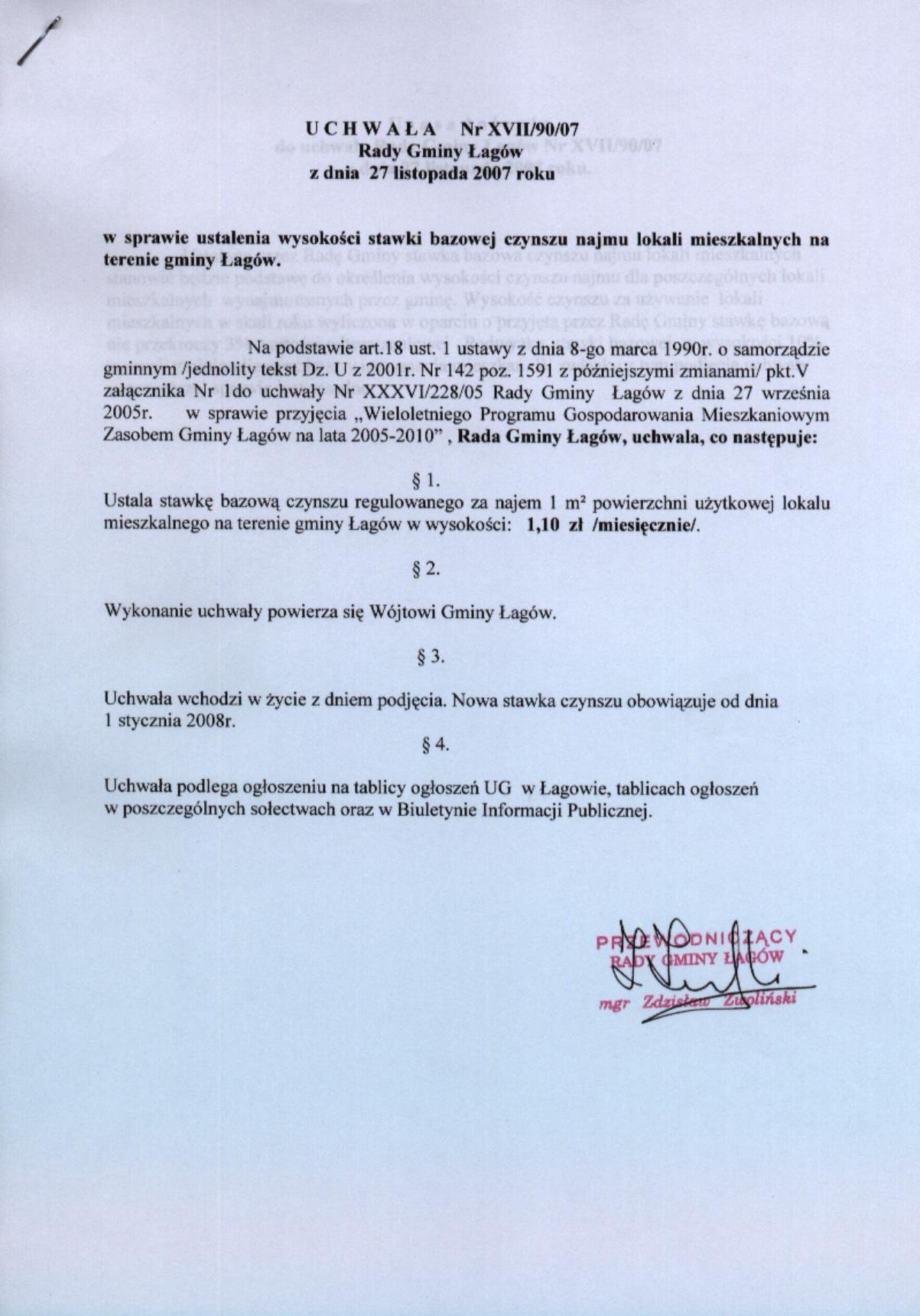 | Uchwała nr XVII/90/07 Rady Gminy Łagów z dnia 27 listopada 2007 r. w sprawie ustalenia wysokości stawki bazowej czynszu najmu lokali mieszkalnych na terenie gminy Łagów | 2008-08-26 |