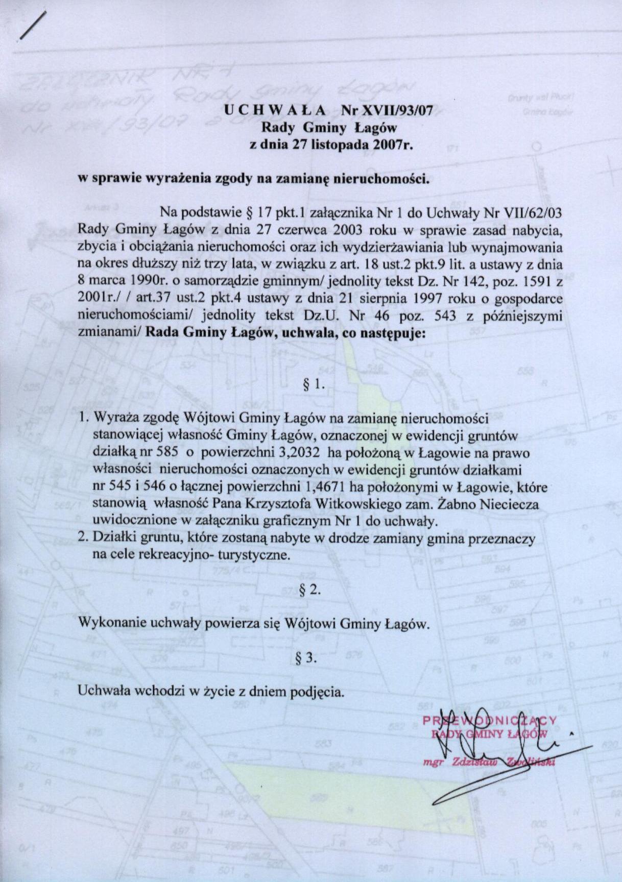 | Uchwała nr XVII/93/07 Rady Gminy Łagów z dnia 27 listopada 2007 r. w sprawie wyrażenia zgody na zamianę nieruchomości | 2008-08-26 |