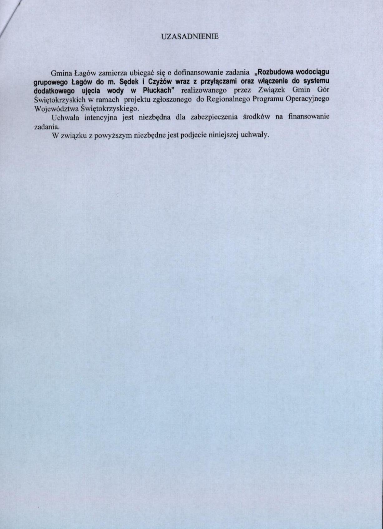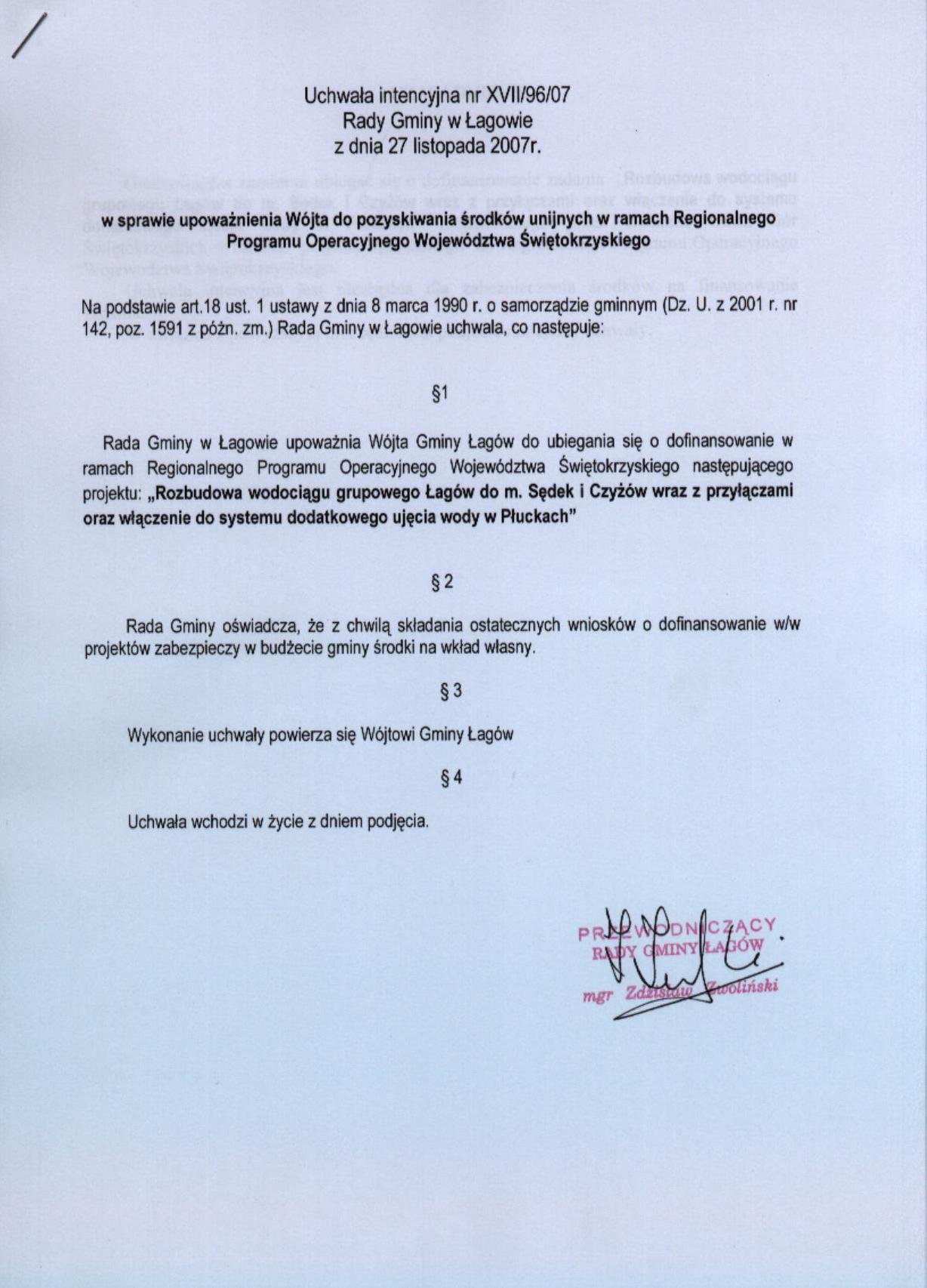 | Uchwała nr XVII/96/07 Rady Gminy Łagów z dnia 27 listopada 2007 r. w sprawie upoważnienia Wójta do pozyskiwania środków unijnych w ramach Regionalnego Programu Operacyjnego Województwa Świętokrzyskiego | 2008-08-26 |
