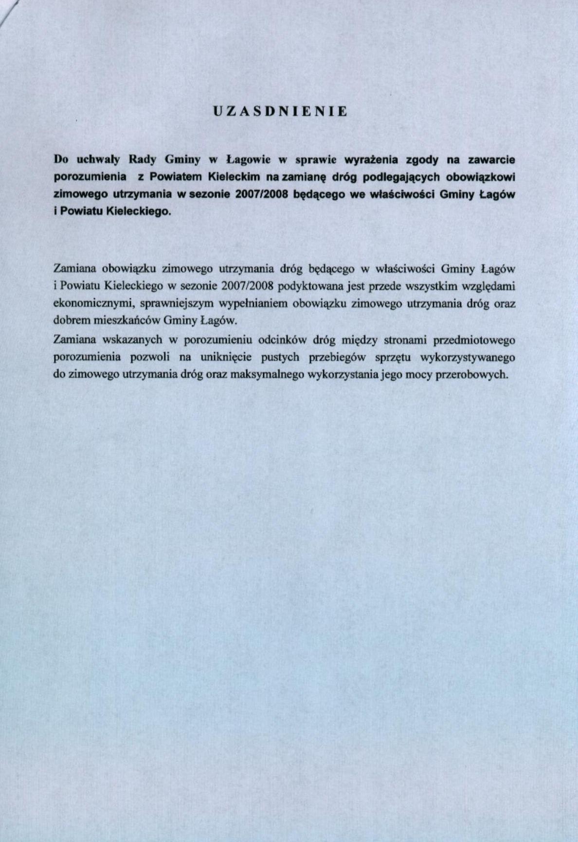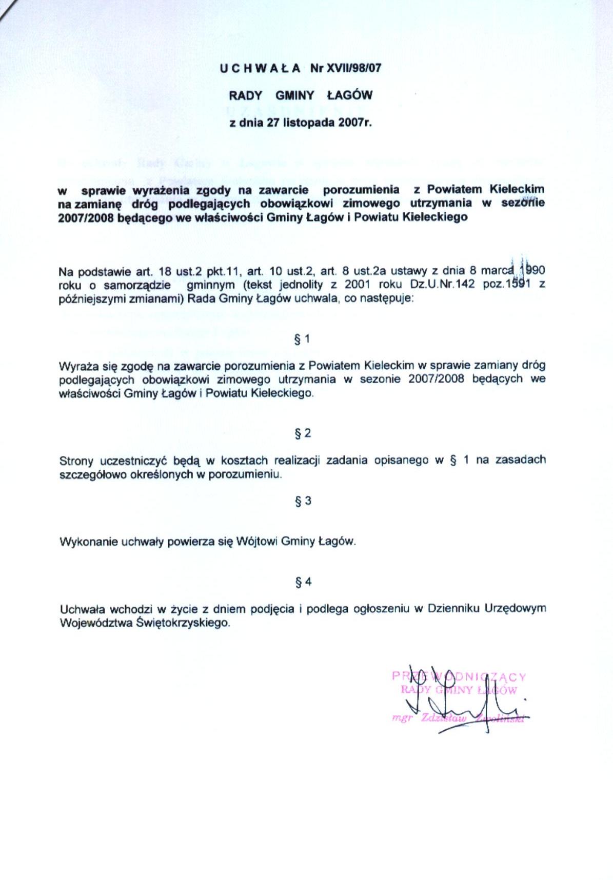 | Uchwała nr XVII/98/07 Rady Gminy Łagów z dnia 27 listopada 2007 r. w sprawie wyrażenia zgody na zawarcie porozumienia z Powiatem Kieleckim na zamiane dróg podlegających obowiązkowi zimowego utrzymania w sezonie 2007/2008... | 2008-08-26 |