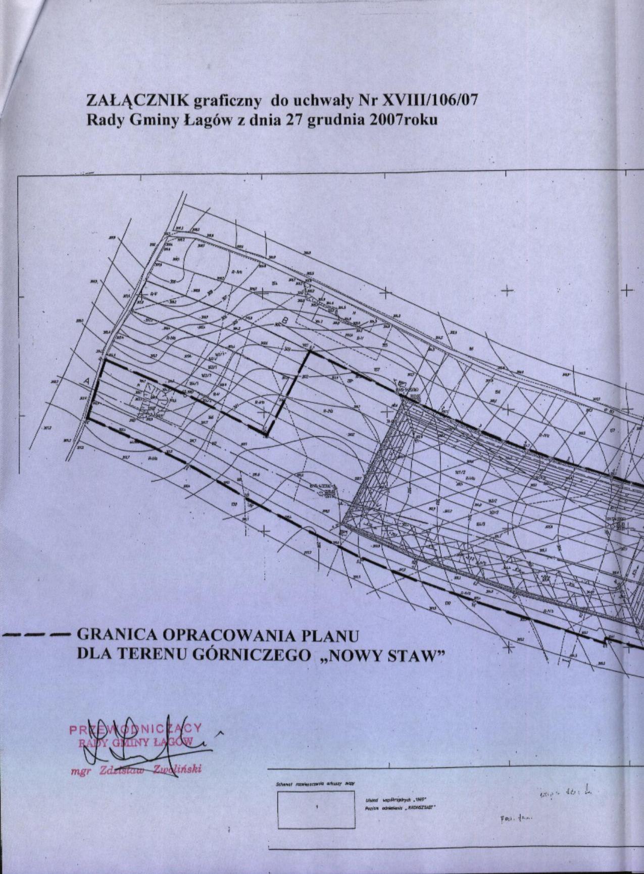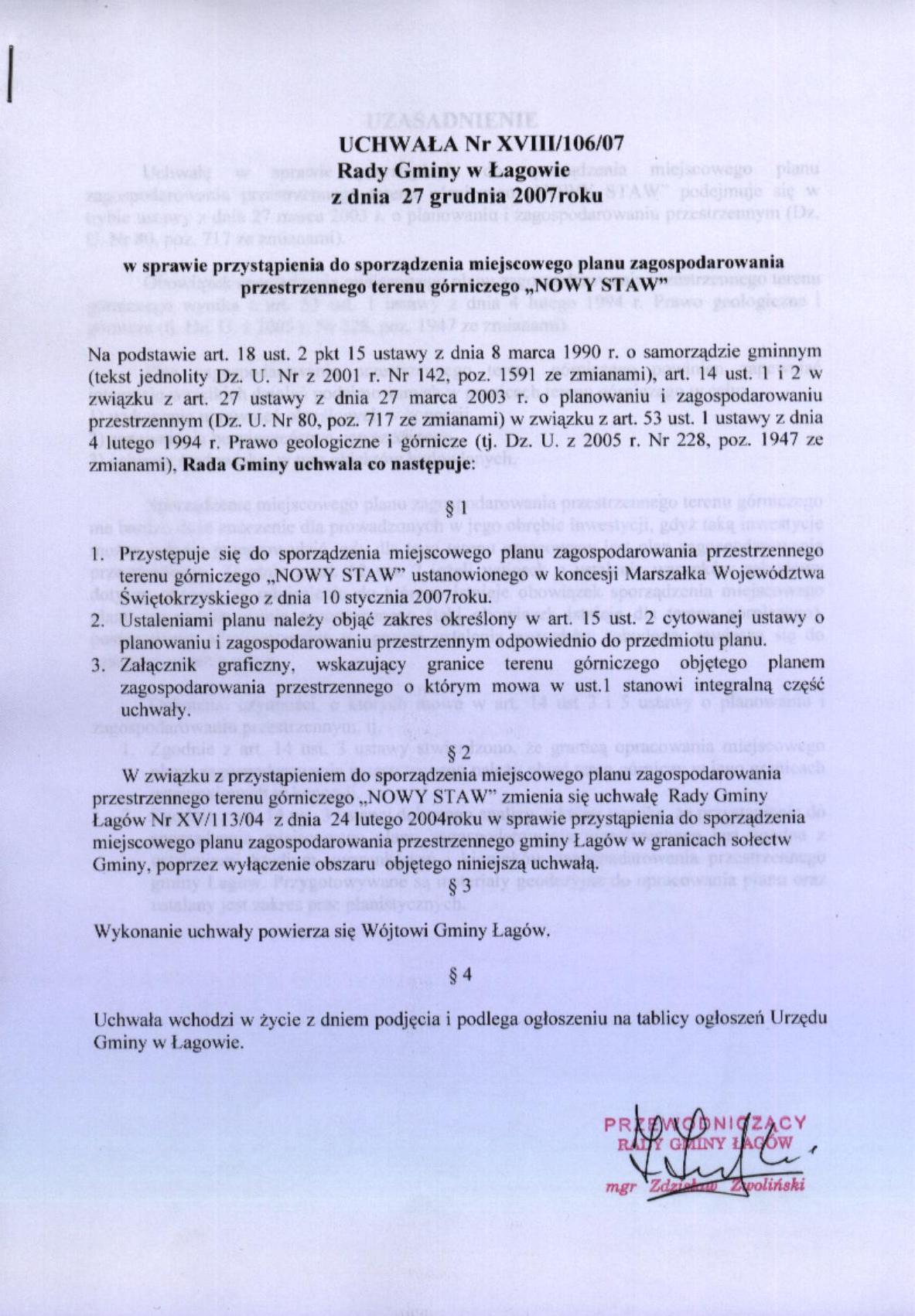 | Uchwała nr XVIII/106/07 Rady Gminy Łagów z dnia 27 grudnia 2007 r. w sprawie przystapienia do sporządzania miejscowego planu zagospodarowania przestrzennego terenu górniczego | 2008-08-27 |