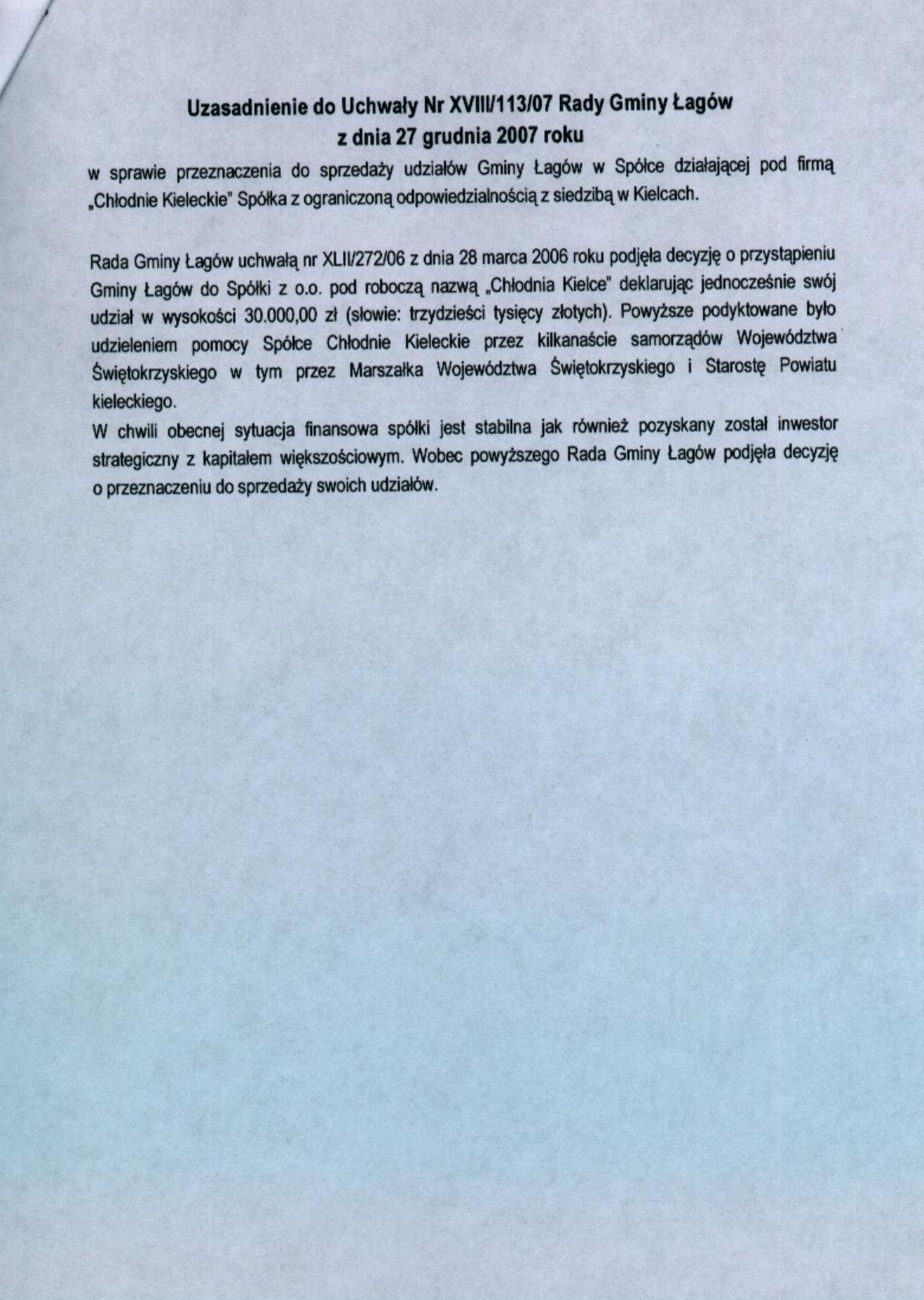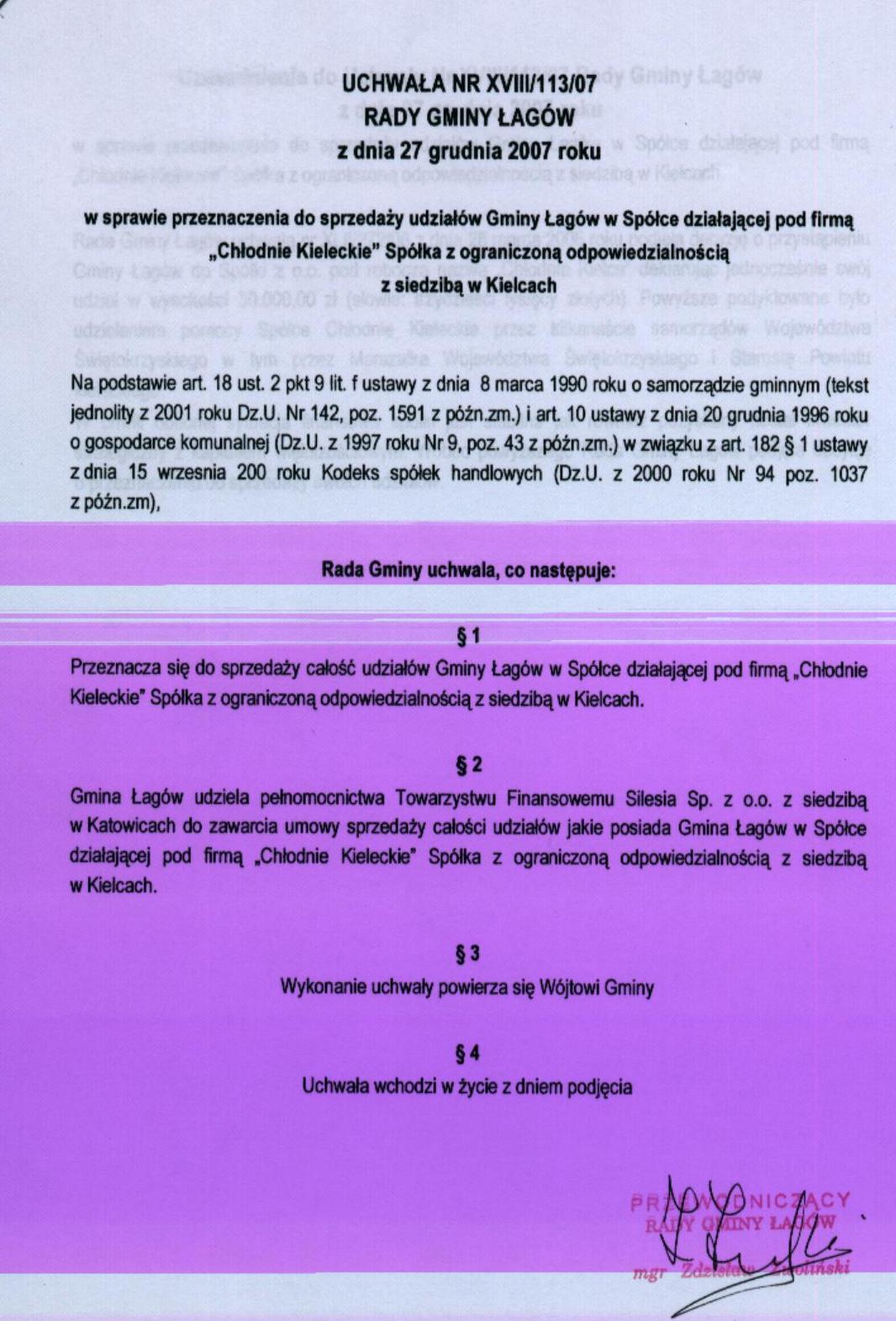 | Uchwała nr XVIII/113/07 Rady Gminy Łagów z dnia 27 grudnia 2007 r. w sprawie przeznaczenia do sprzedaży udziałów Gminy Łagów w Spółce działającej pod nazwą "Chłodnie Kieleckie" Spółka z o.o. z siedzibą w Kielcach | 2008-08-27 |