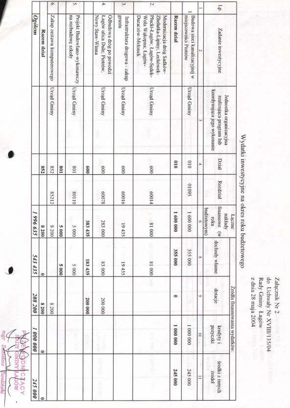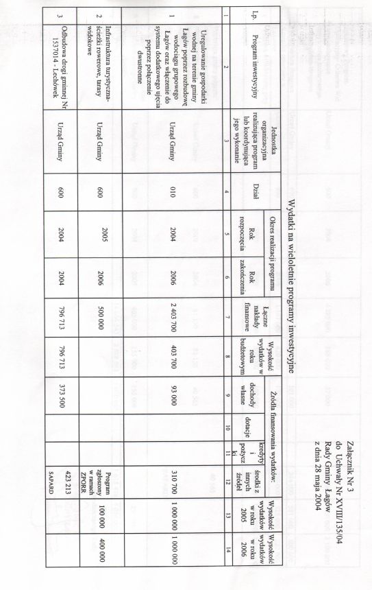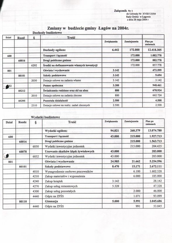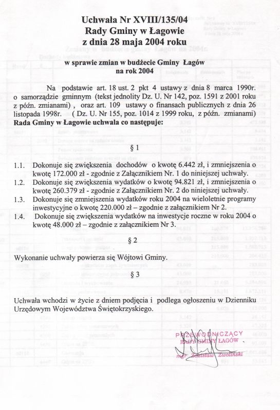 | Uchwała nr XVIII/135/04 Rady Gminy w Łagowie z dn. 28 maja 2004 r. w sprawie zmiana w budżecie Gminy Łagów na rok 2004. | 2008-10-22 |