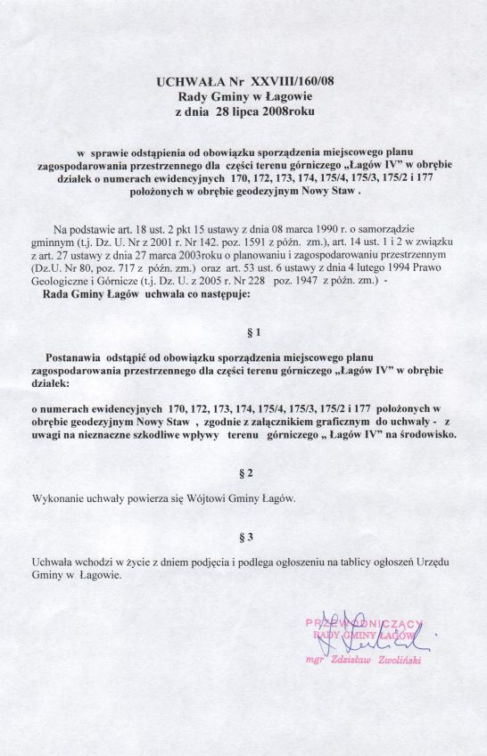 | Uchwała nr XVIII/160/08 Rady Gminy Łagów z dnia 28 lipca 2008 r. w sprawie odstąpienia od obowiązku sporządzania miejscowego planu zagospodarowania przestrzennego dla terenu górniczego "Łagów IV" | 2008-10-02 |