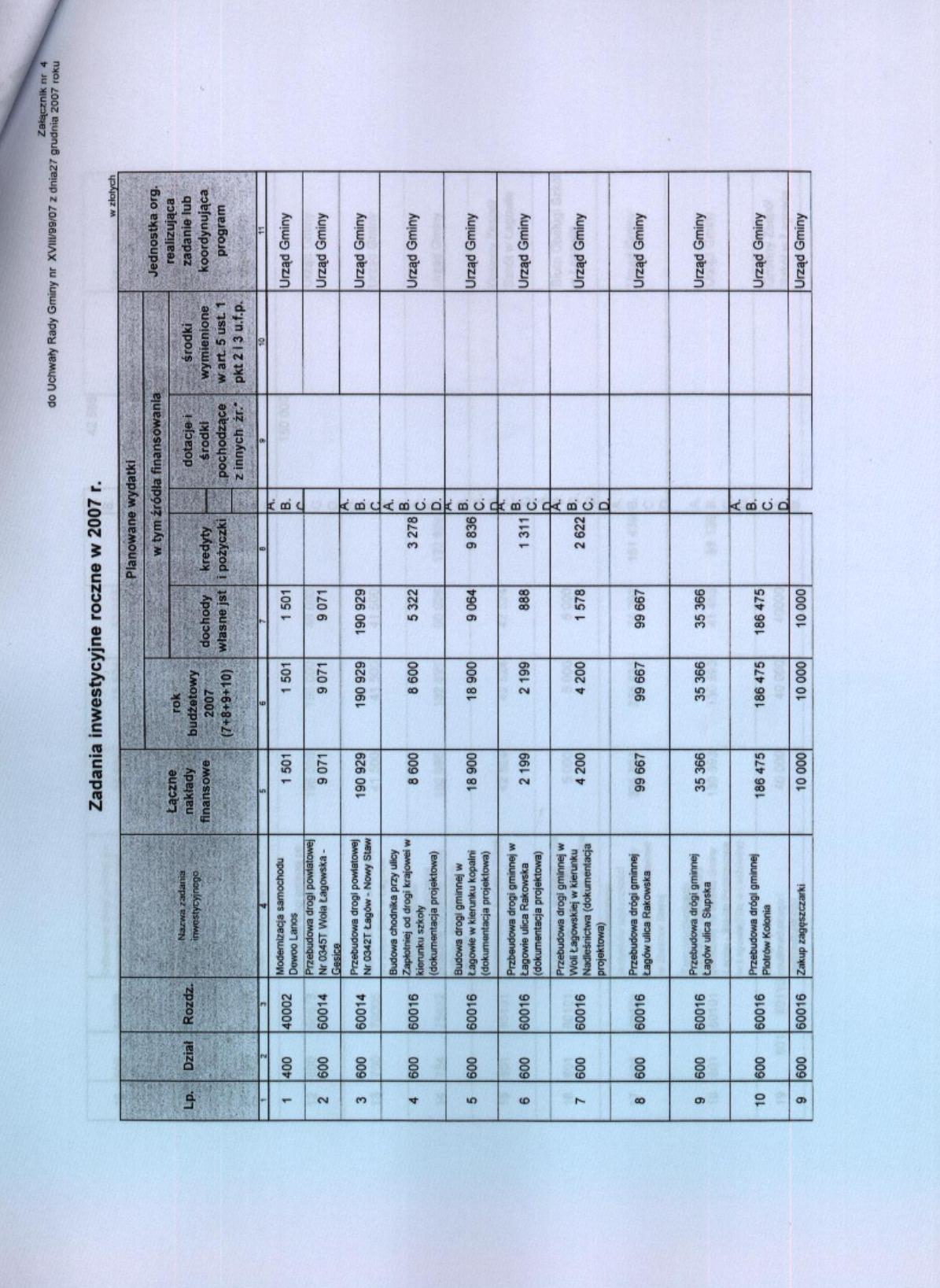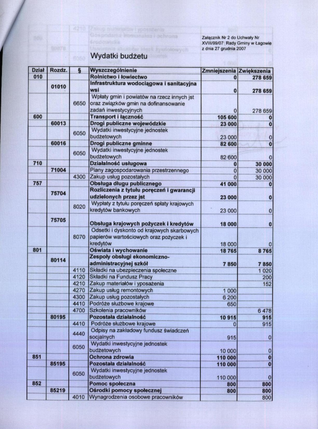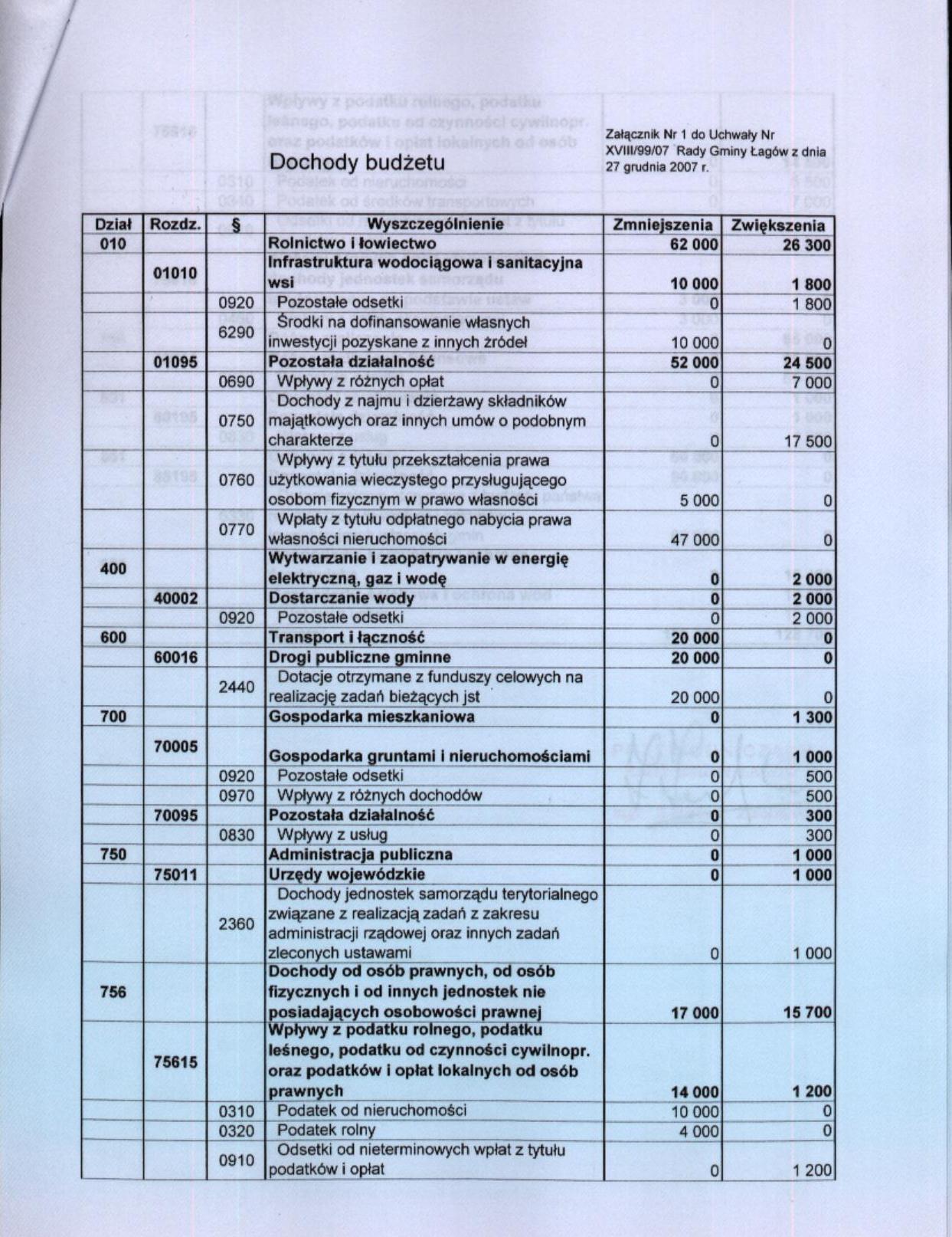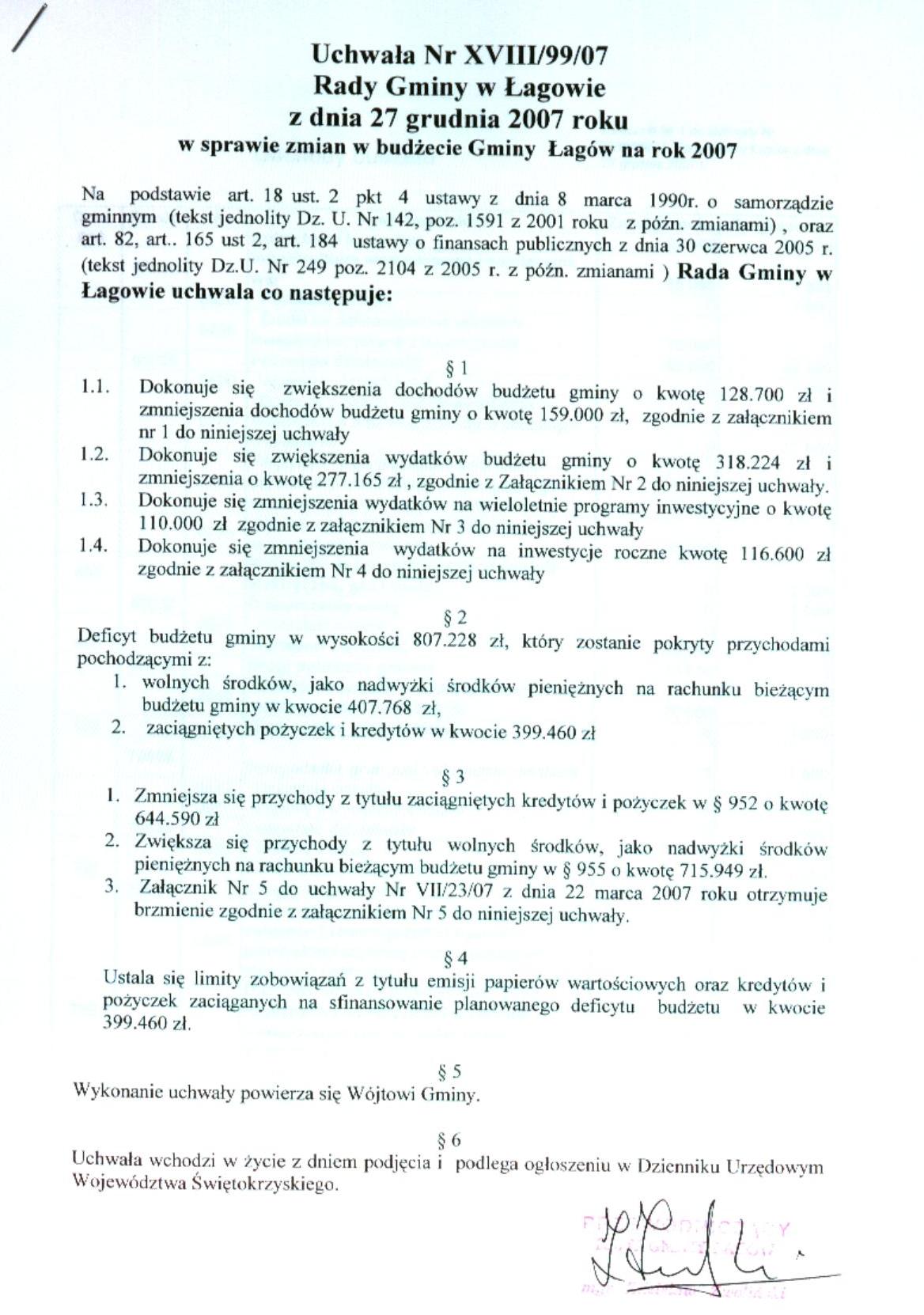 | Uchwała nr XVIII/99/07 Rady Gminy Łagów z dnia 27 grudnia 2007 r. w sprawie zmian w budżecie Gminy Łagów na rok 2007 | 2008-08-26 |