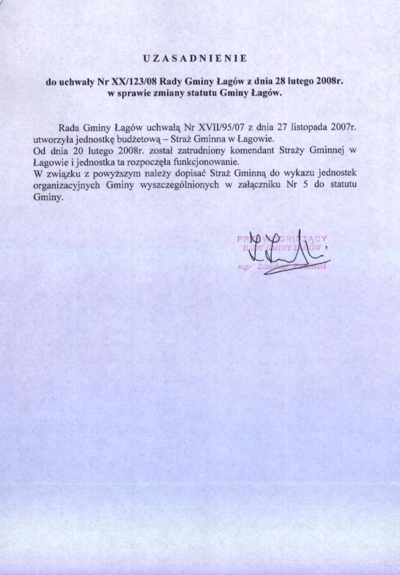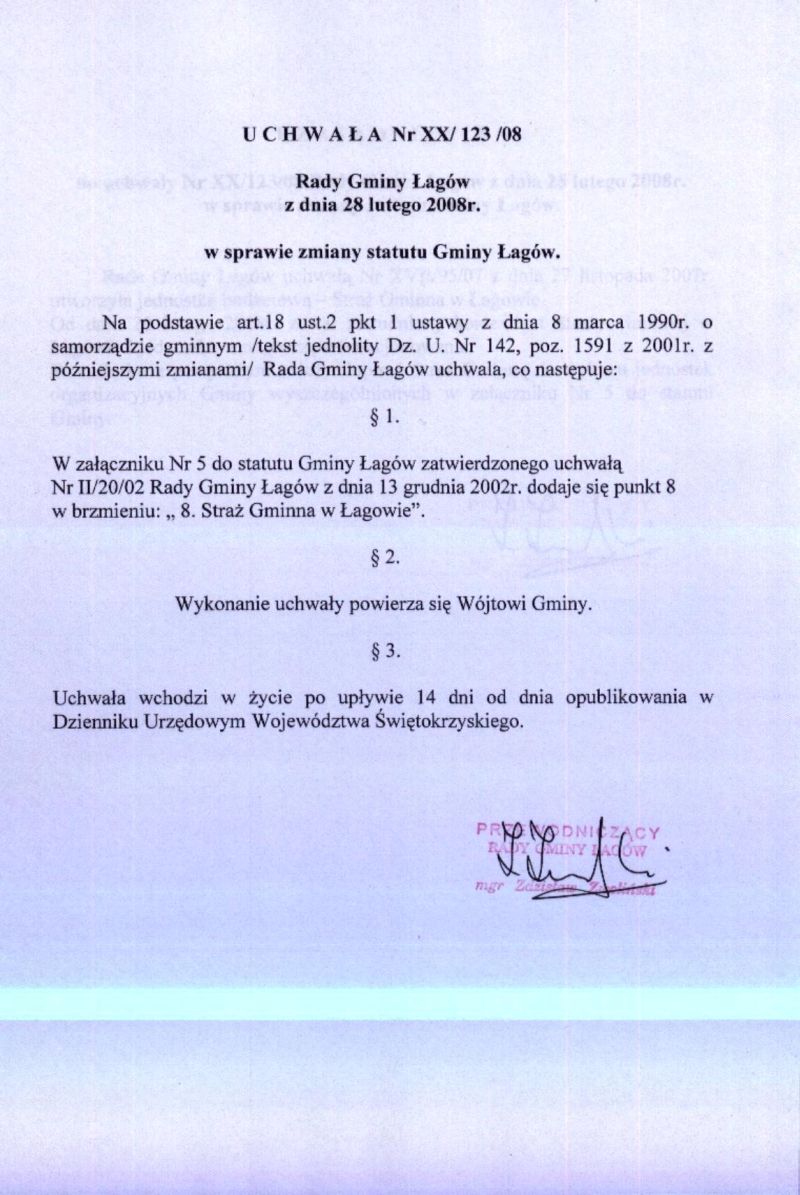 | Uchwała nr XX/123/08 Rady Gminy Łagów z dnia 28 lutego 2008 r. w sprawie zmiany statutu Gminy Łagów | 2008-08-14 |