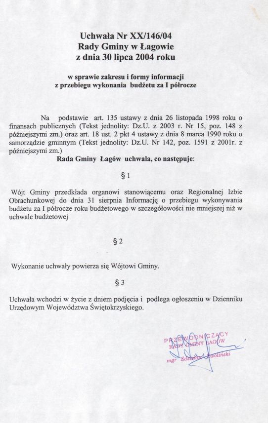 | Uchwała nr XX/146/04 Rady Gminy w Łagowie z dn. 30 lipca 2004 r. w sprawie zakresu i formy informacji z przebiegu wykonania budżetu za I półrocze. | 2008-10-22 |