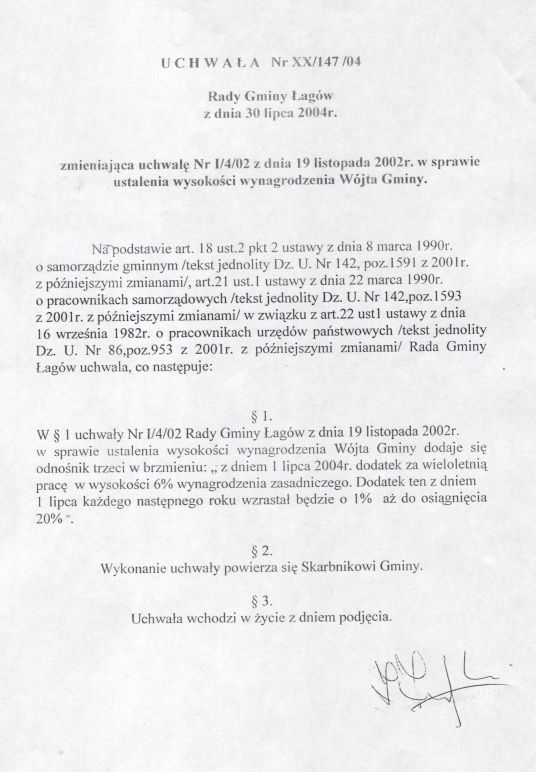 | Uchwała nr XX/147/04 Rady Gminy w Łagowie z dn. 30 lipca 2004 r. zmieniająca uchwałę Nr I/4/02 z dnia 19 listopada 2002 r. w sprawie ustalenia wysokości wynagrodzenia Wójta Gminy. | 2008-10-22 |