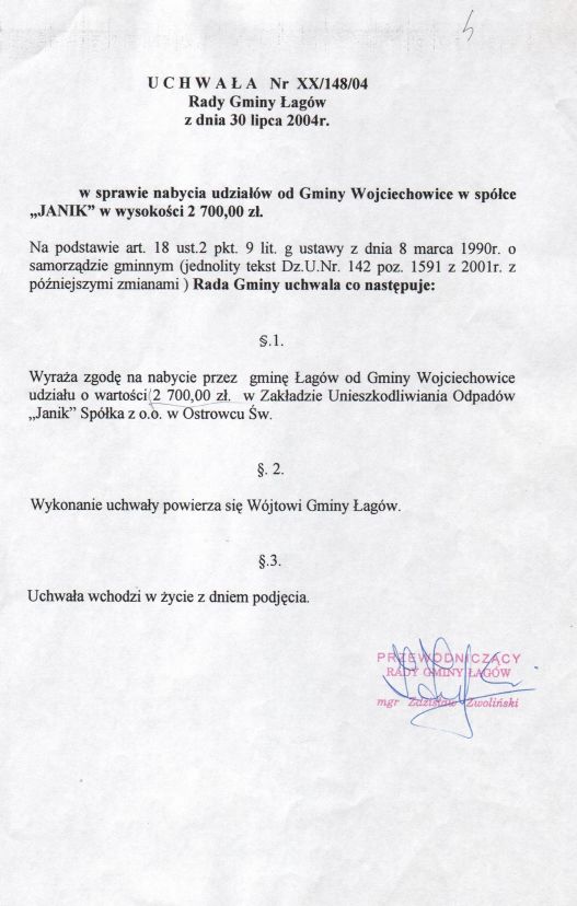 | Uchwała nr XX/148/04 Rady Gminy w Łagowie z dn. 30 lipca 2004 r. w sprawie nabycia udziałów od Gminy Wojciechowice w spółce „JANIK” w wysokości 2 700,00 zł. | 2008-10-22 |