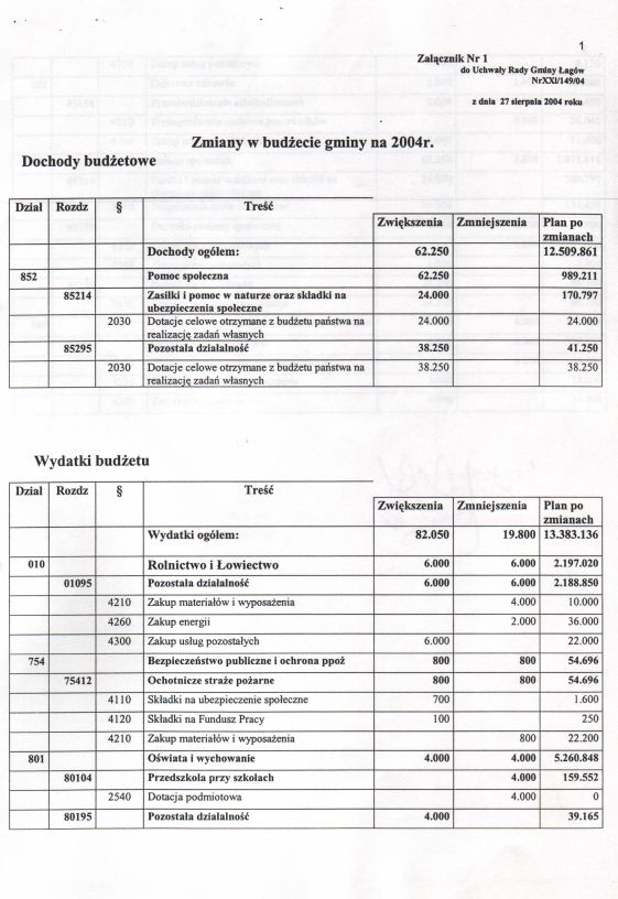 | Uchwała nr XXI/149/04 Rady Gminy w Łagowie z dn. 27 września 2004 r. w sprawie zmian w budżecie Gminy Łagów na rok 2004. | 2008-10-22 |
