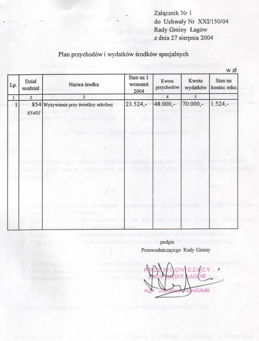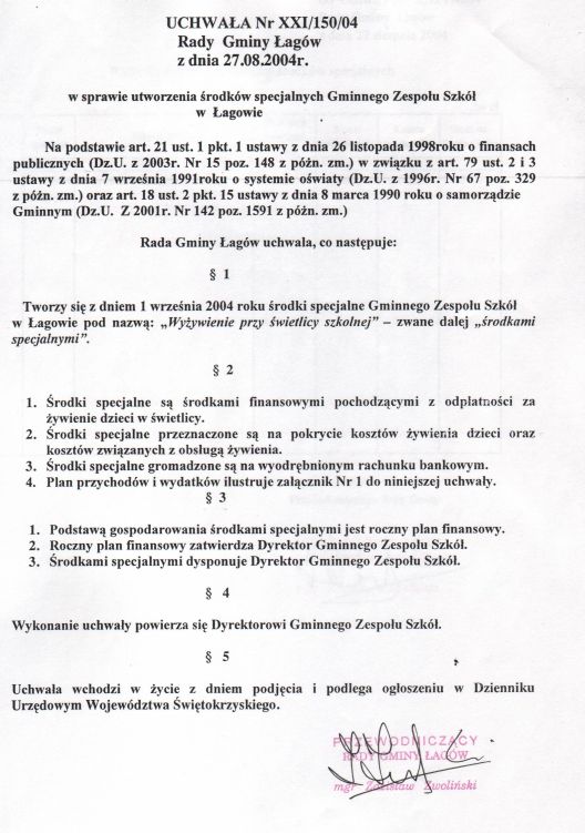 | Uchwała nr XXI/150/04 Rady Gminy w Łagowie z dn. 27 września 2004 r. w sprawie utworzenia środków specjalnych Gminnego Zespołu Szkół w Łagowie. | 2008-10-22 |
