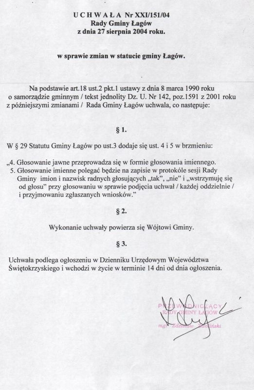 | Uchwała nr XXI/151/04 Rady Gminy w Łagowie z dn. 27 sierpnia 2004 r. w sprawie zmian w statucie gminy Łagów. | 2008-10-22 |
