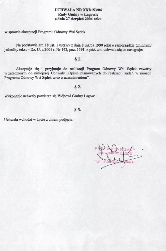 | Uchwała nr XXI/153/04 Rady Gminy w Łagowie z dn. 27 sierpnia 2004 r. w sprawie akceptacji Programu Odnowy Wsi Sędek. | 2008-10-22 |
