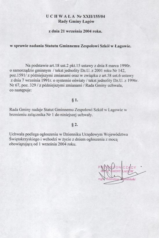 | Uchwała nr XXII/155/04 Rady Gminy w Łagowie z dn. 21 września 2004 r. w sprawie nadania Statutu Gminnemu Zespołowi Szkół w Łagowie. | 2008-10-22 |
