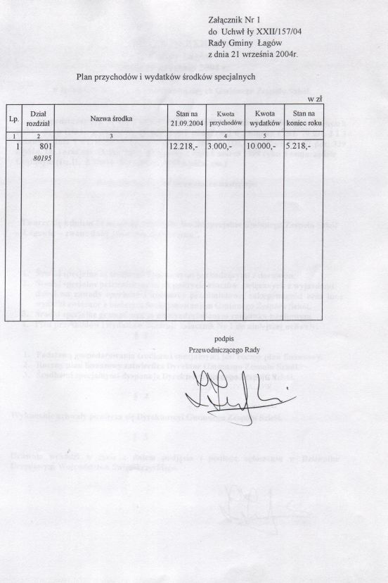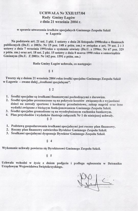 | Uchwała nr XXII/157/04 Rady Gminy w Łagowie z dn. 21 września 2004 r. w sprawie utworzenia środków specjalnych Gminnego Zespołu Szkół w Łagowie. | 2008-10-22 |