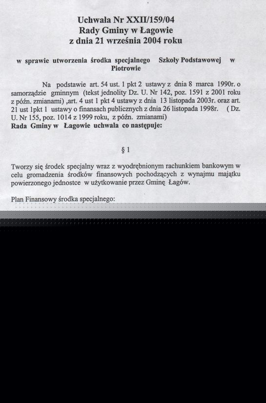 | Uchwała nr XXII/159/04 Rady Gminy w Łagowie z dn. 21 września 2004 r. w sprawie utworzenia środka specjalnego Szkoły Podstawowej w Piotrowie. | 2008-10-22 |