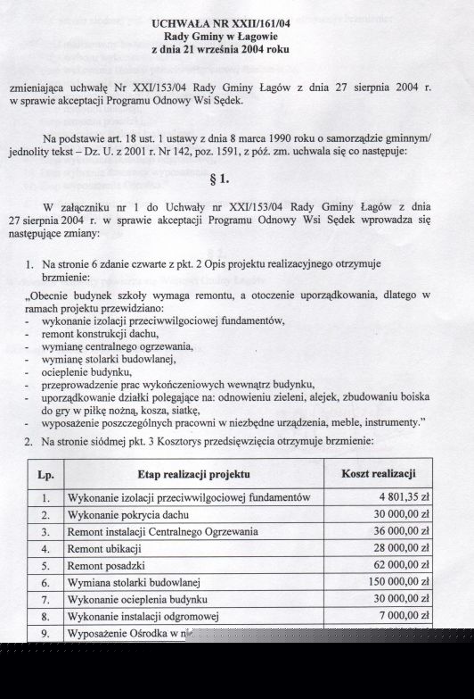 | Uchwała nr XXII/161/04 Rady Gminy w Łagowie z dn. 21 września 2004 r. zmieniająca uchwałę Nr XXI/153/04 Rada Gminy Łagów z dnia 27 sierpnia 2004 r. w sprawie akceptacji Programu Odnowy Wsi Sędek. | 2008-10-22 |