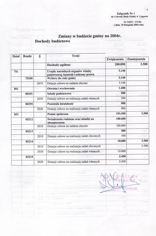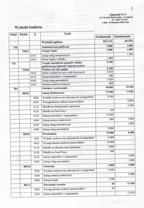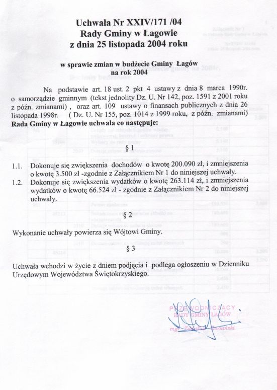 | Uchwała nr XXIV/171/04 Rady Gminy w Łagowie z dn. 25 listopada 2004 r. w sprawie zmian w budżecie Gminy Łagów na rok 2004. | 2008-10-22 |