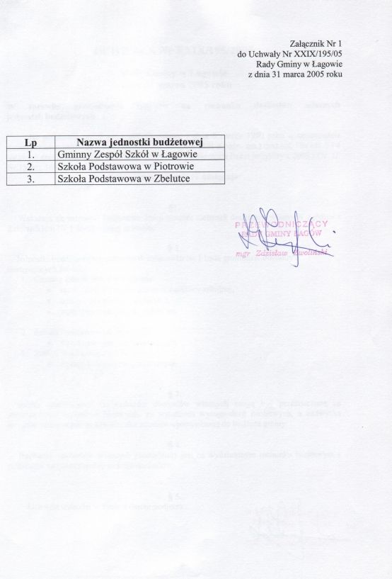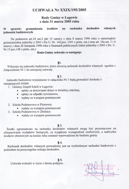 | Uchwała nr XXIX/195/05 Rady Gminy w Łagowie z dn. 31 marca 2005 r. w sprawie: gromadzenia środków na rachunku dochodów własnych jednostek budżetowych. | 2008-10-17 |