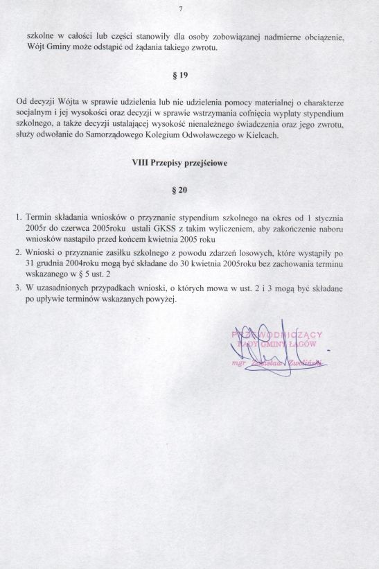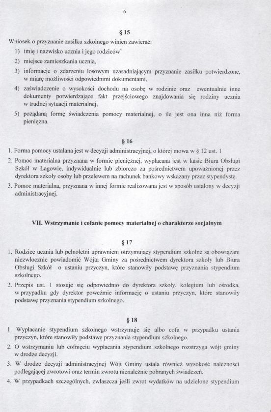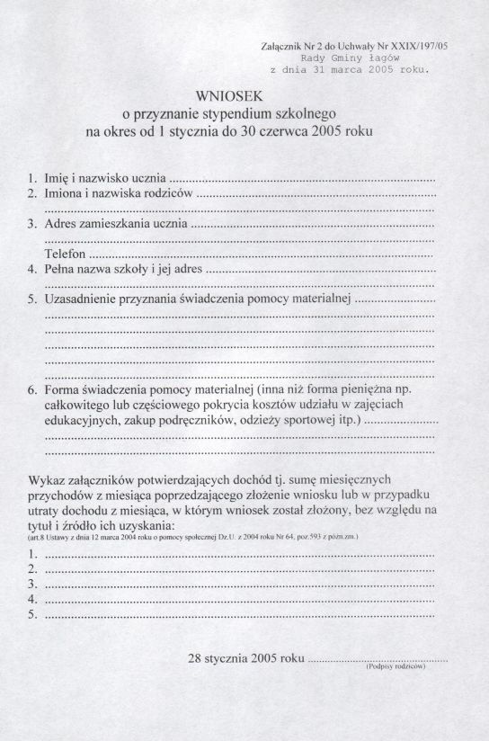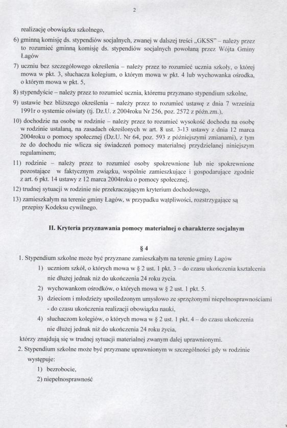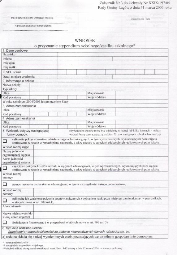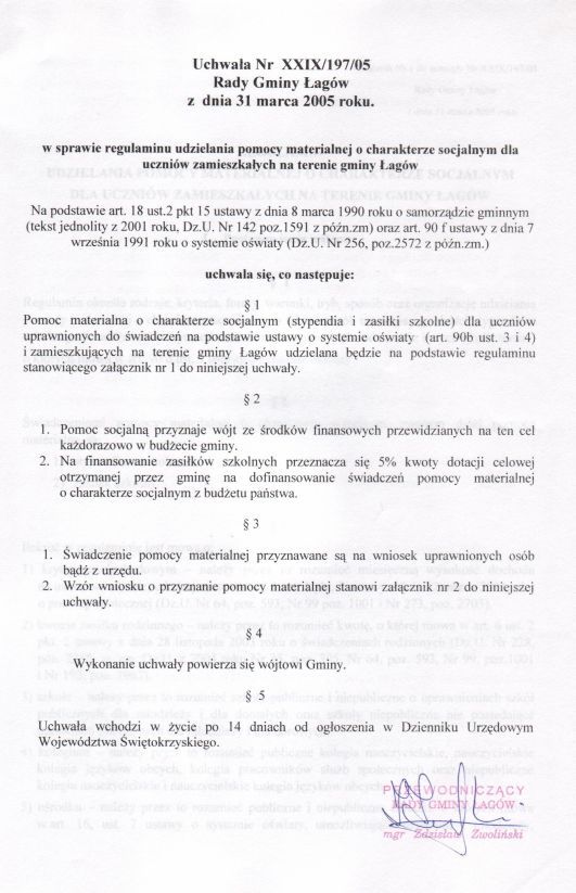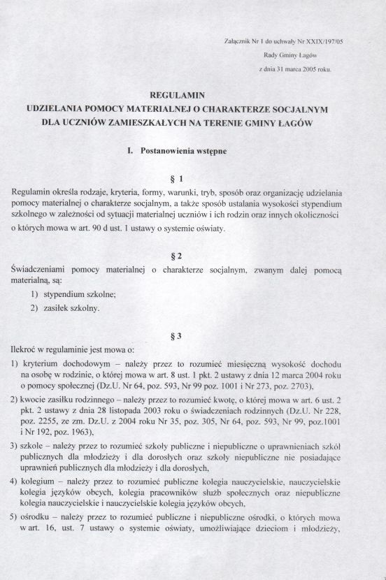 | Uchwała nr XXIX/197/05 Rady Gminy w Łagowie z dn. 31 marca 2005 r. w sprawie regulaminu udzielania pomocy materialnej o charakterze socjalnym dla uczniów zamieszkałych na terenie gminy Łagów. | 2008-10-17 |