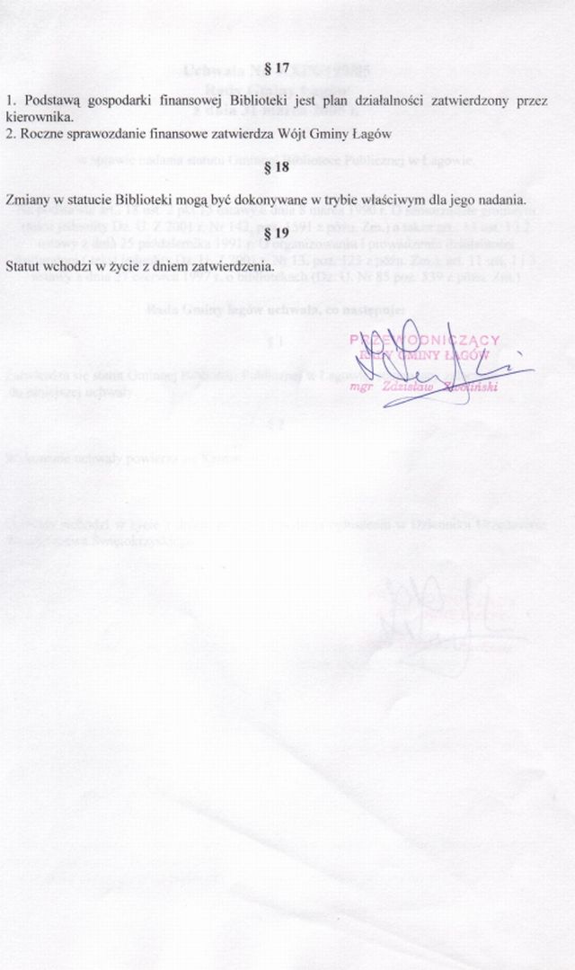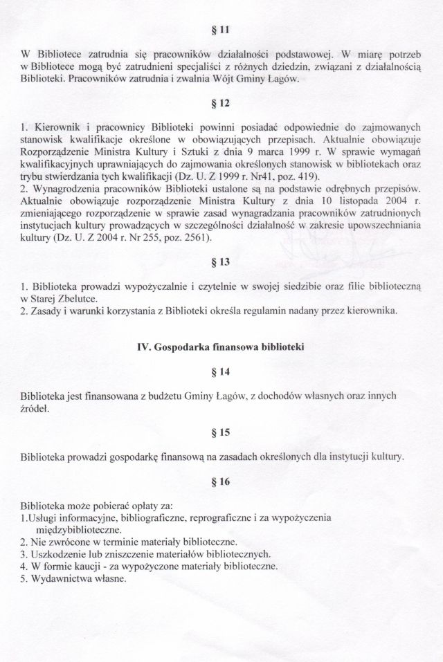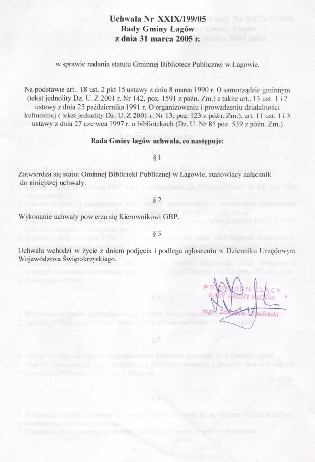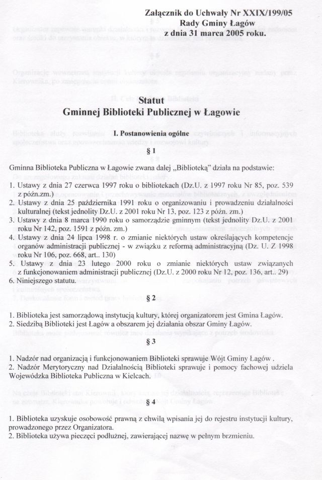 | Uchwała nr XXIX/199/05 Rady Gminy w Łagowie z dn. 31 marca 2005 r. w sprawie nadania statutu Gminnej Bibliotece Publicznej w Łagowie. | 2008-10-17 |