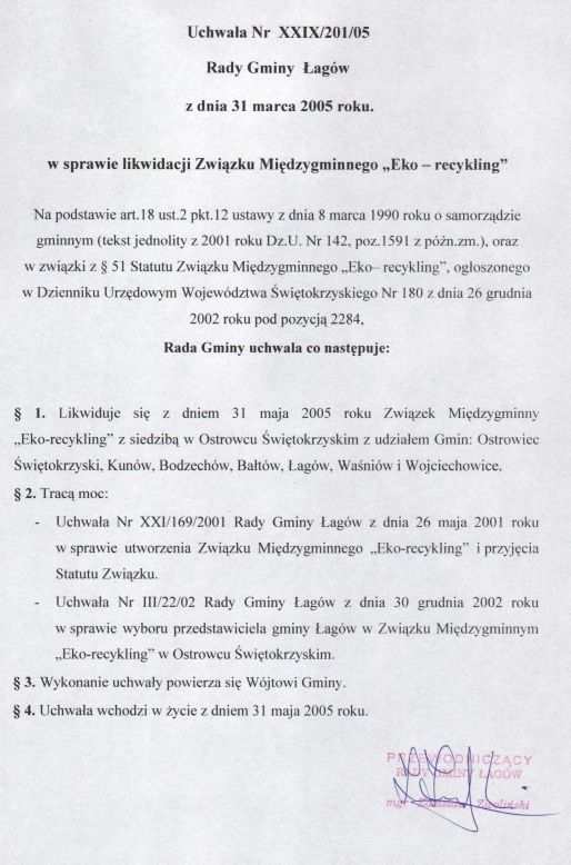 | Uchwała nr XXIX/201/05 Rady Gminy w Łagowie z dn. 31 marca 2005 r. w sprawie likwidacji Związku Miedzygminnego "Eko - recykling". | 2008-10-17 |