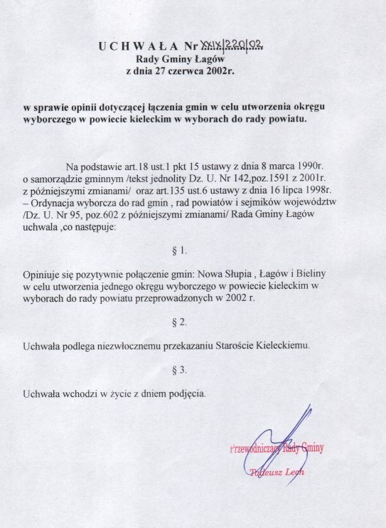 | Uchwała nr XXIX/220/02 Rady Gminy Łagów z dn. 27 czerwca 2002 r. w sprawie opinii dotyczącej łączenia gmin w celu utworzenia okręgu wyborczego w powiecie kieleckim w wyborach do rady powiatu. | 2008-10-31 |