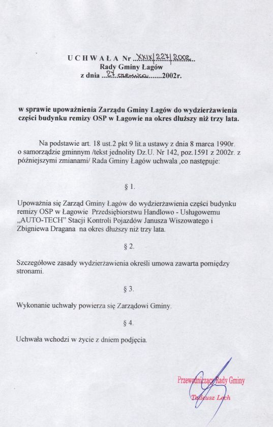 | Uchwała nr XXIX/227/02 Rady Gminy Łagów z dn. 27 czerwca 2002 r. w sprawie upoważnienia Zarządu Gminy Łagów do wydzierżawienia części budynku remizy OSP w Łagowie na okres dłuższy niż trzy lata. | 2008-10-31 |
