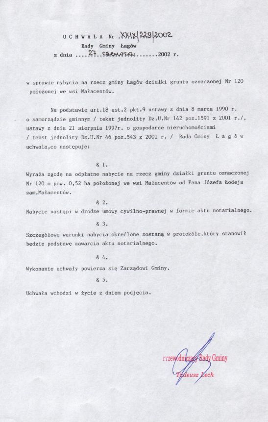 | Uchwała nr XXIX/229/02 Rady Gminy Łagów z dn. 27 czerwca 2002 r. w sprawie nabycia na rzecz gminy Łagów działki gruntu oznaczonej Nr 120 położonej we wsi Małacentów. | 2008-10-31 |