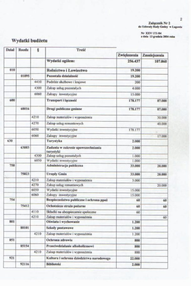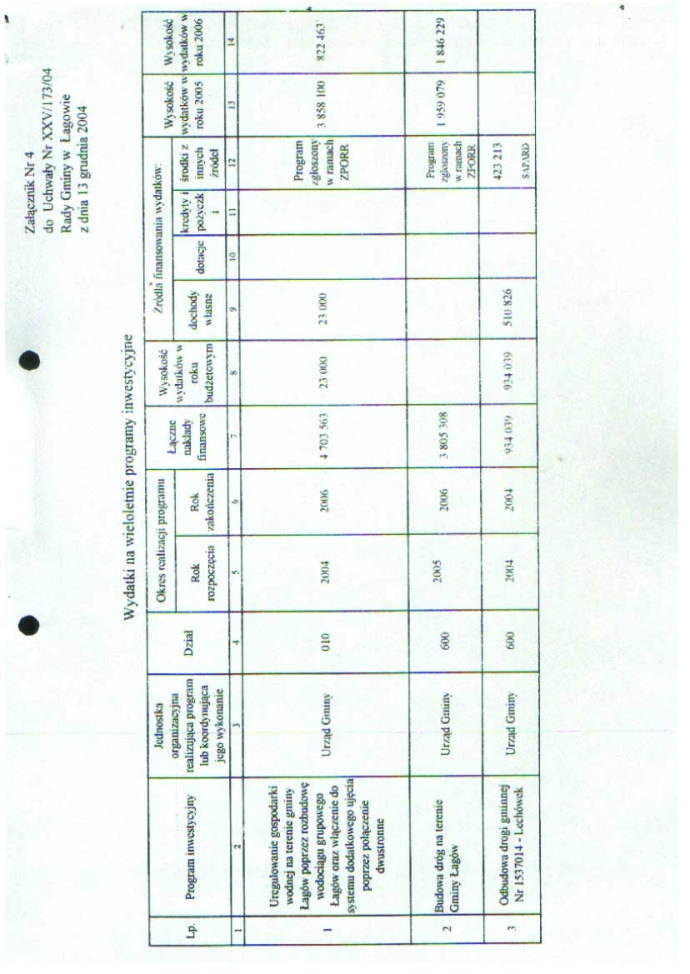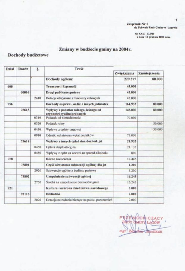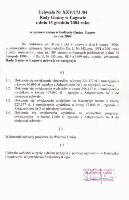 | Uchwała nr XXV/173/04 Rady Gminy w Łagowie z dn.13 grudnia 2004 r. w sprawie zmian w budżecie Gminy Łagów na rok 2004. | 2008-10-22 |